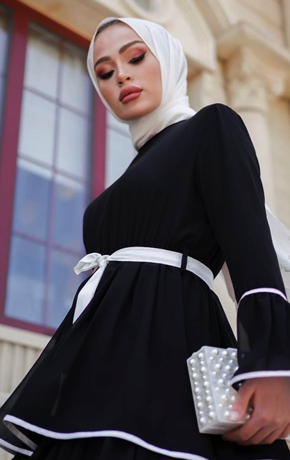 Bestenur Tiered Belted Long Chiffon Dress 155 - Blackk
