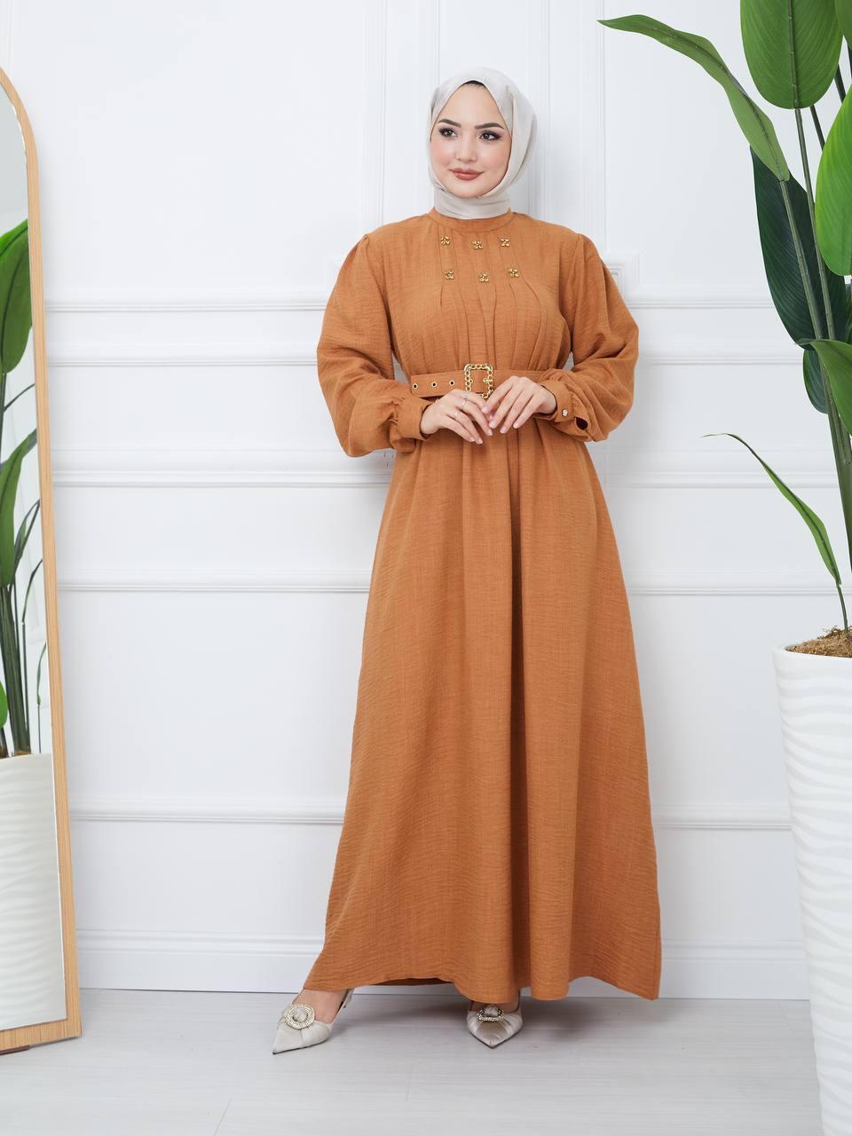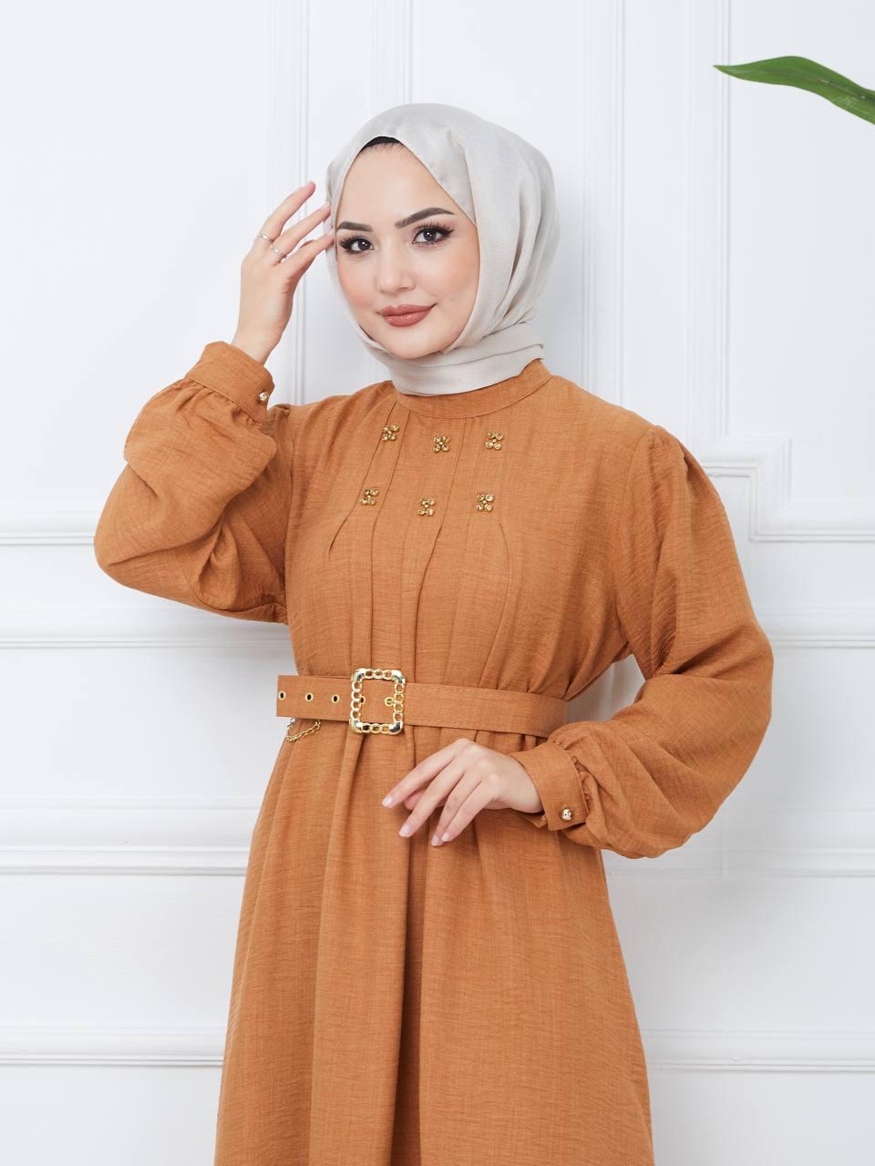 Refka Woman Brown Shawl Patterned Abaya Coat with Tie Collar