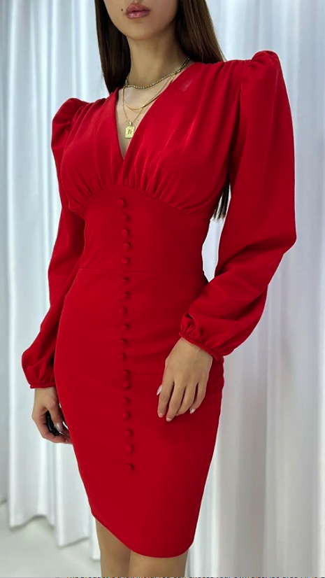 فستان ديفوكس بتفاصيل أزرار خضراء وأكمام طويلة مبطنة مصنوع من قماش الكريب