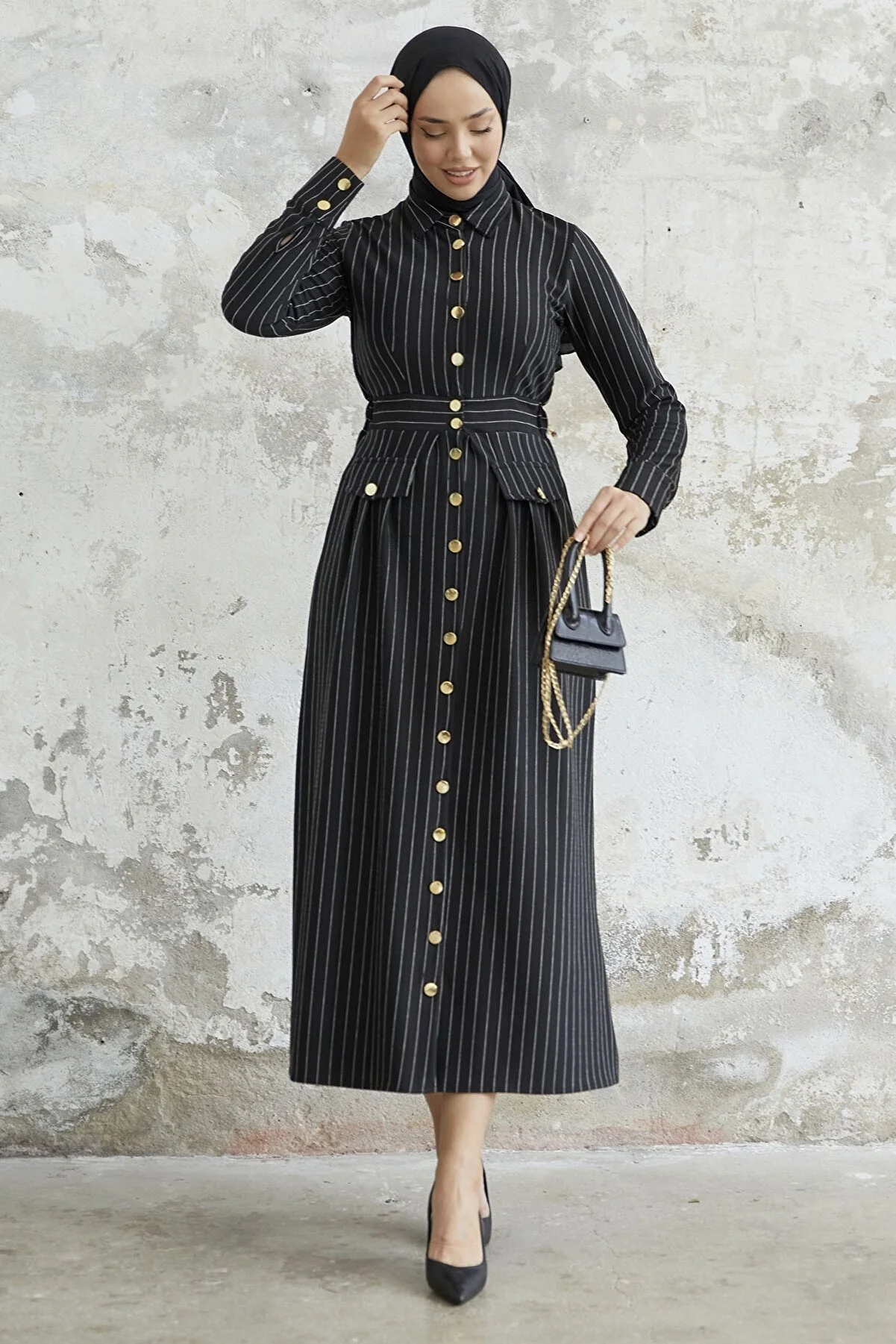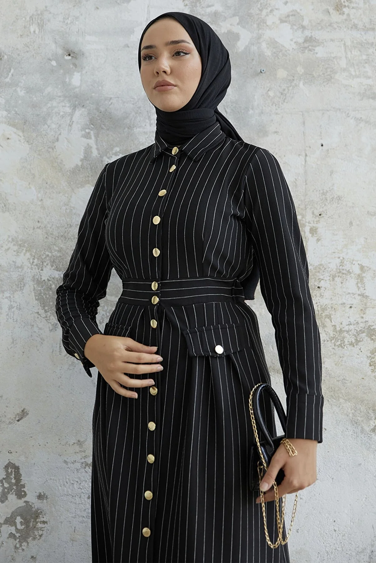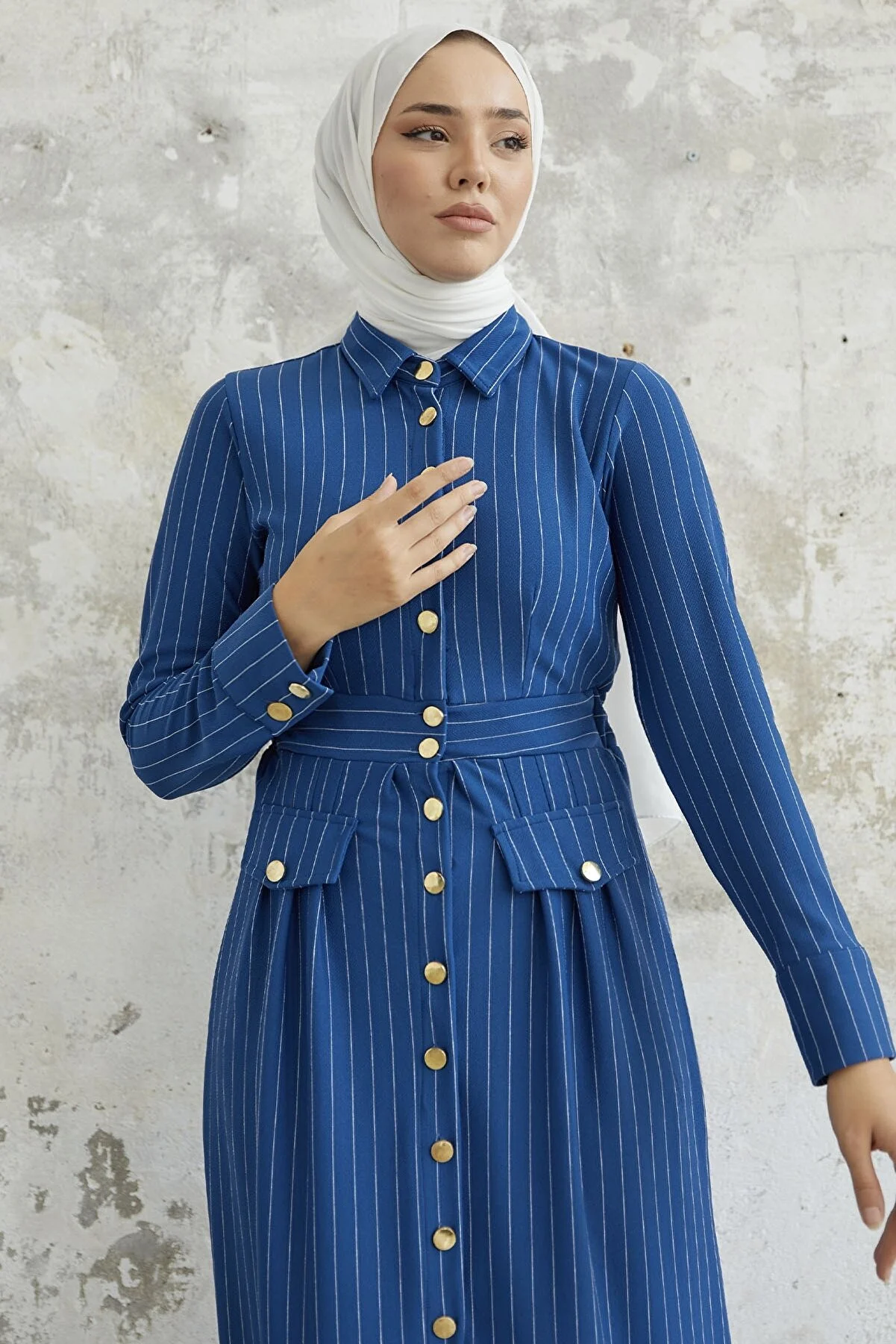 Features a shirt collar, pinstripes, and pocket details.