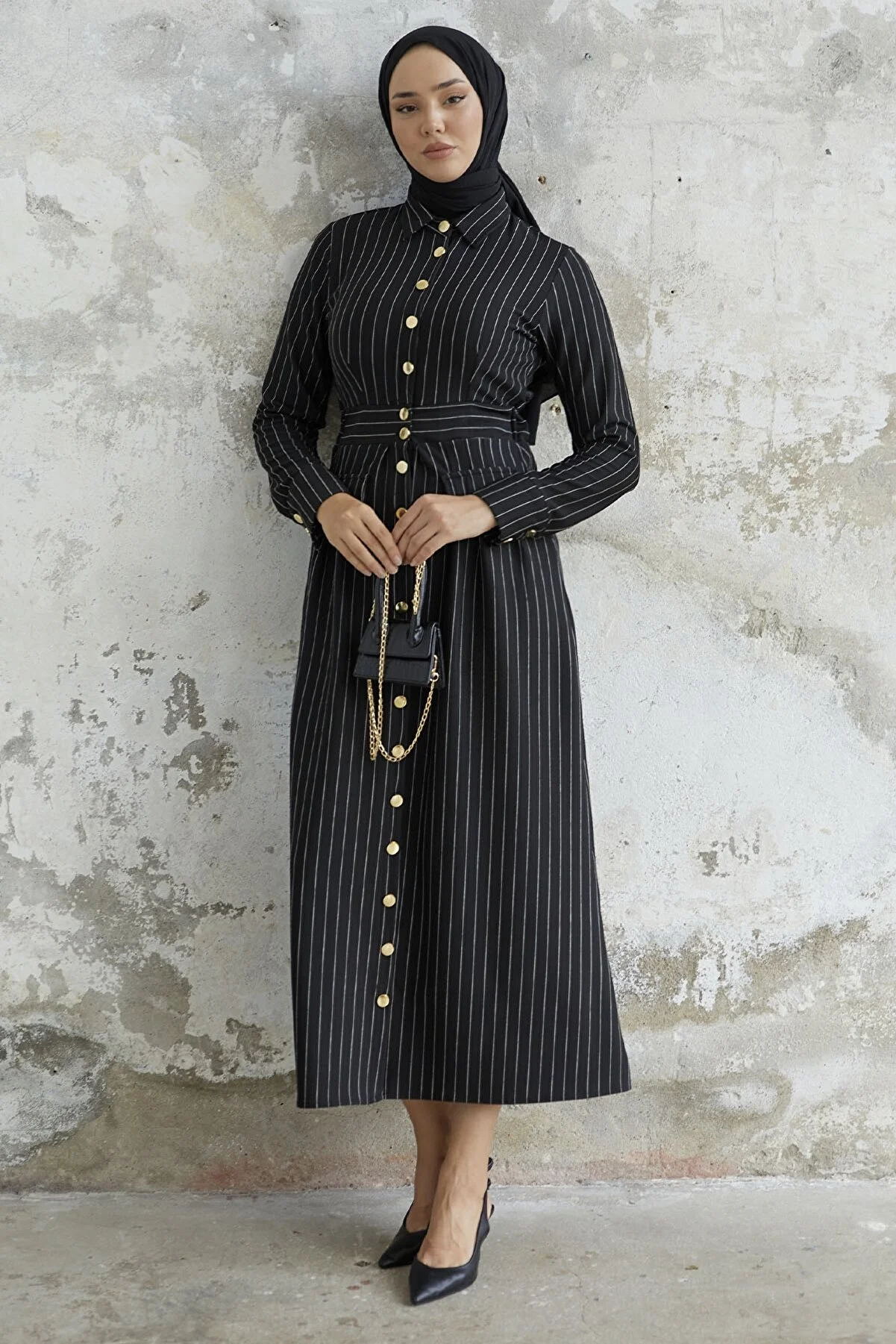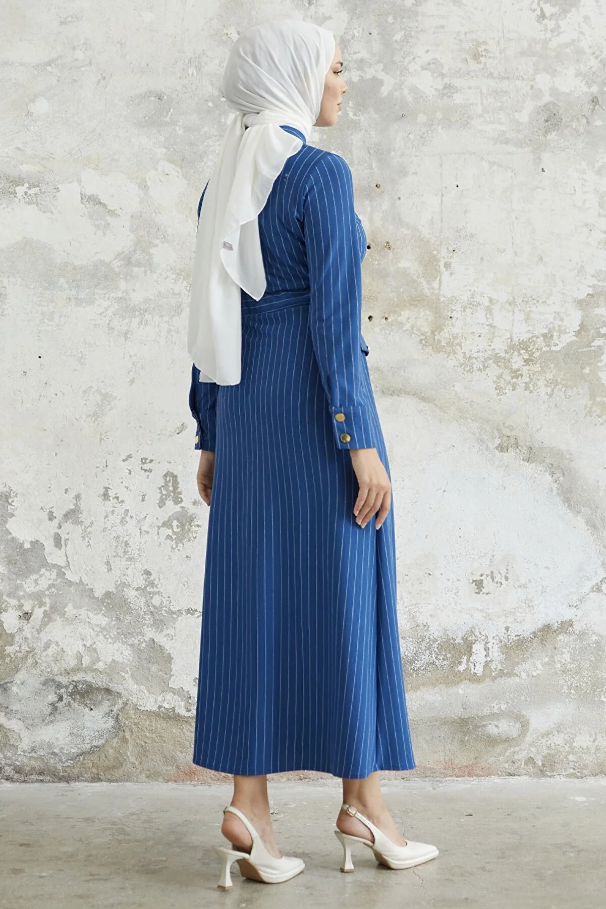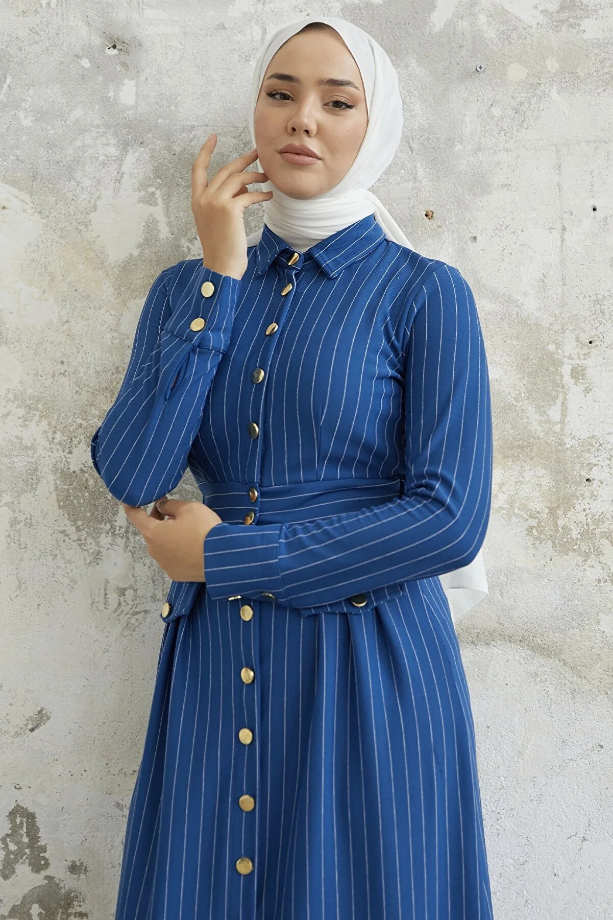 Features a shirt collar, pinstripes, and pocket details.