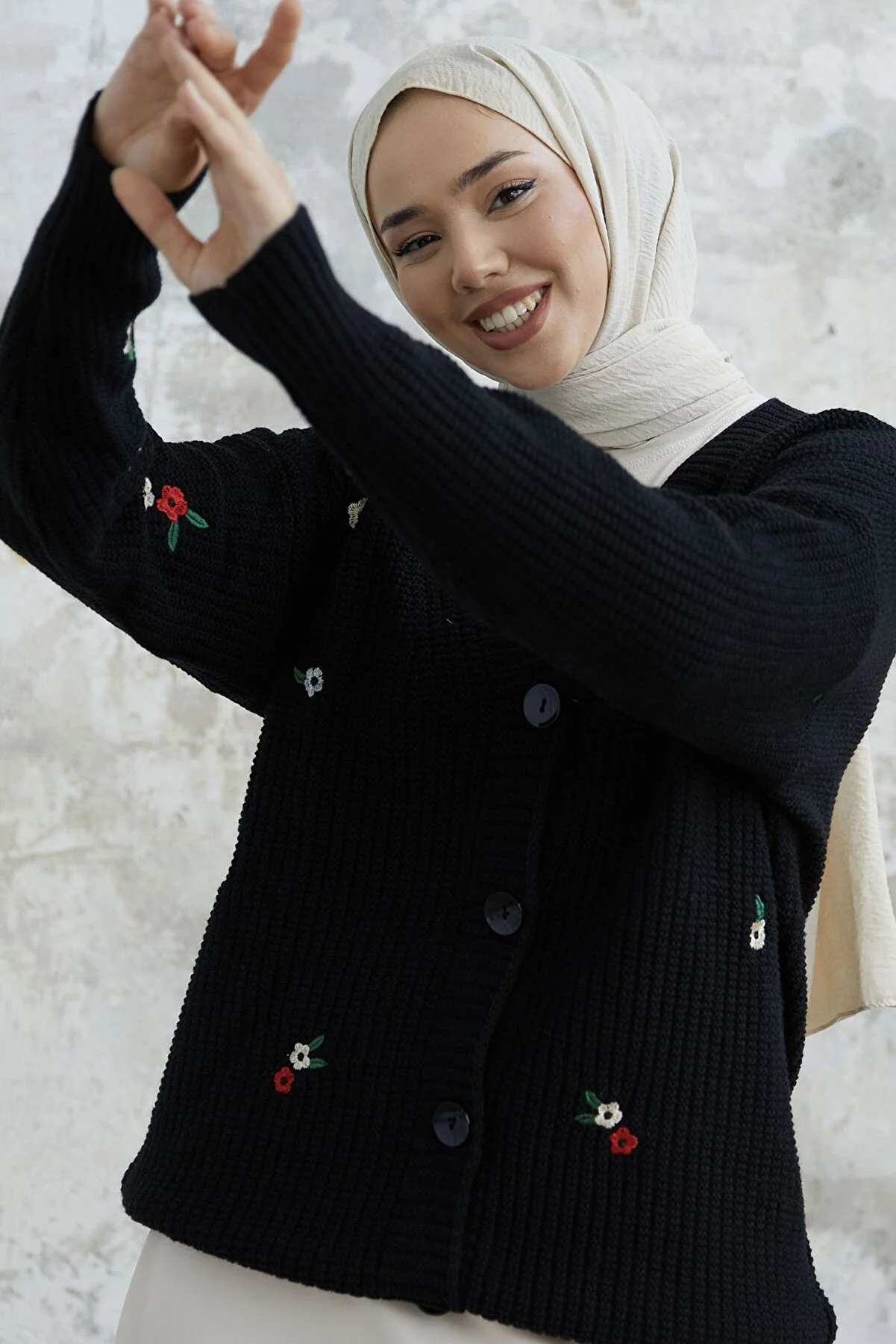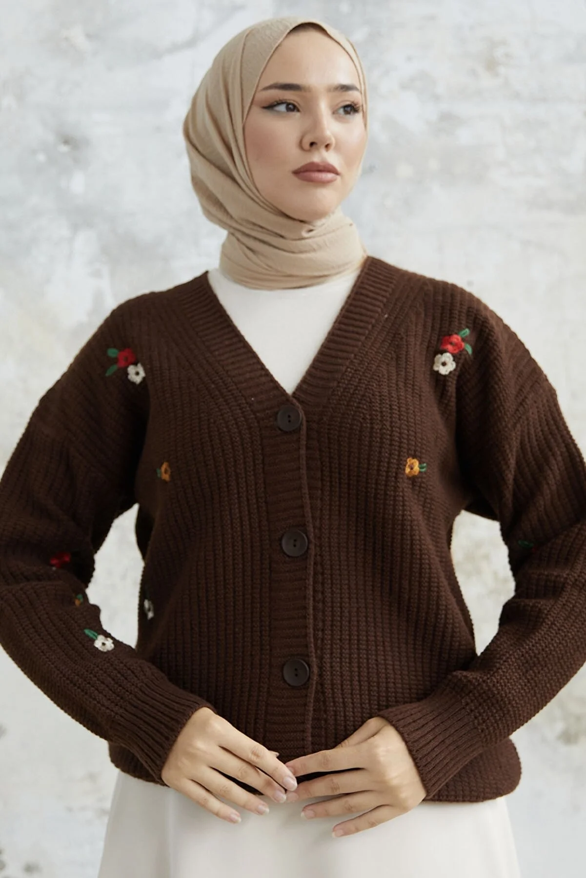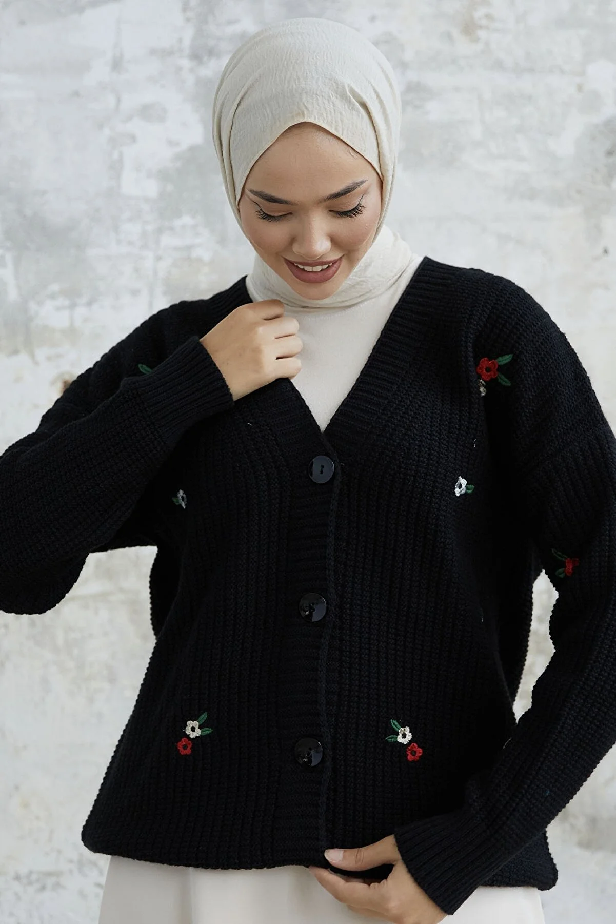 Elevate your style with the Helly Daisy Embroidered Knit Cardigan. This knit cardigan features a charming daisy embroidery and comes with buttons. The knit material is easy to care for, and it's perfect for sizes 38 to 44, with a length of 71 cm. The model in the picture is 175 cm tall with measurements of 68 cm at the waist, 104 cm at the hips, and 90 cm at the chest. Enjoy a cozy and stylish addition to your wardrobe with this unique cardigan.