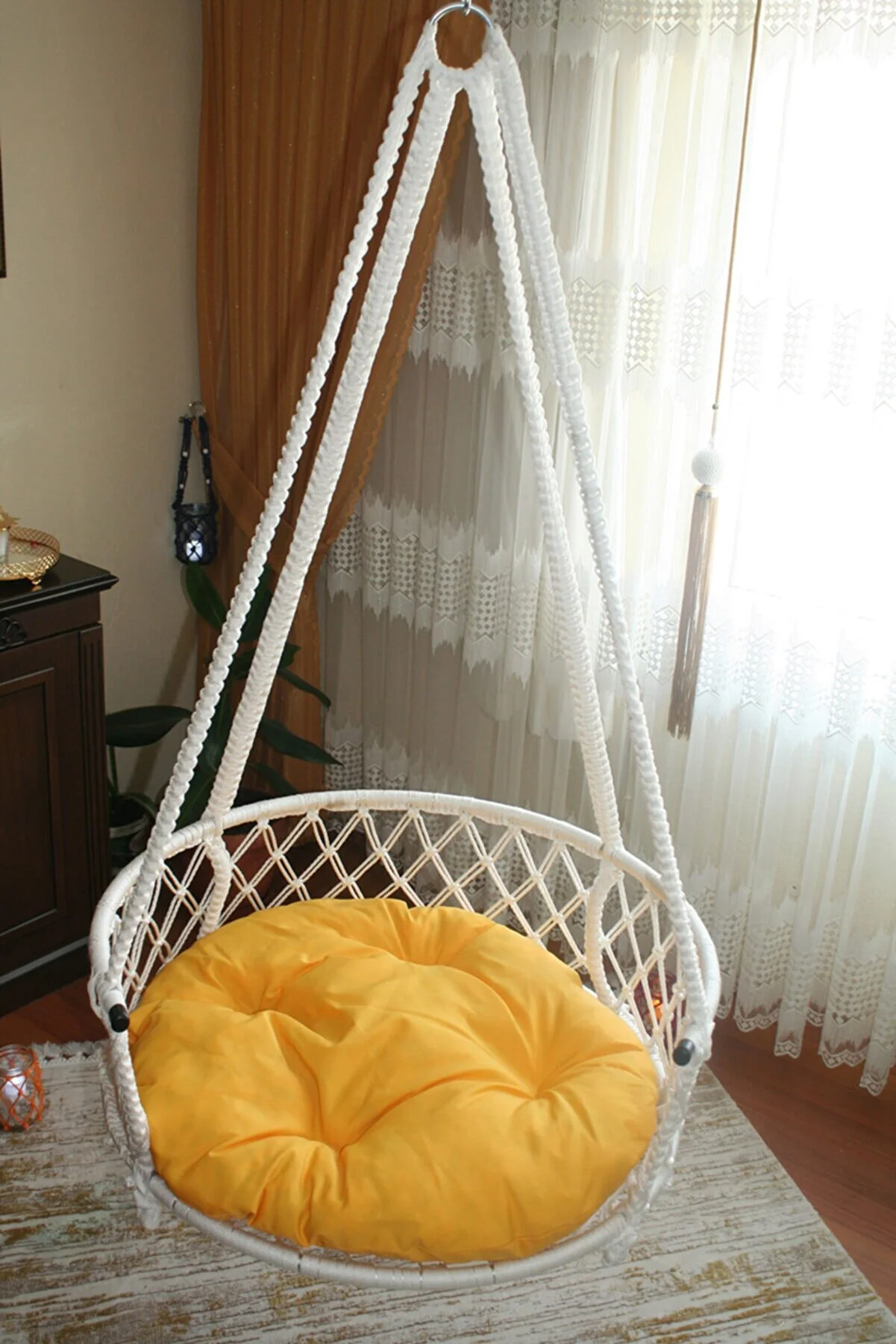 Enhance Your Decor with a Stylish Macrame Hanging Swing Chair for Indoor and Outdoor Use in Home, Patio, Yard, and Garden Versatile usage: Suitable for home, garden, and picnics. Sturdy and durable: Can support up to 120 kg. Easy installation: Comes with steel anchor and instructions. Comfortable cushion included. Adjustable height: Maximum height of 230 cm with rope. Available in various colors. Ready-to-use product with no assembly required.