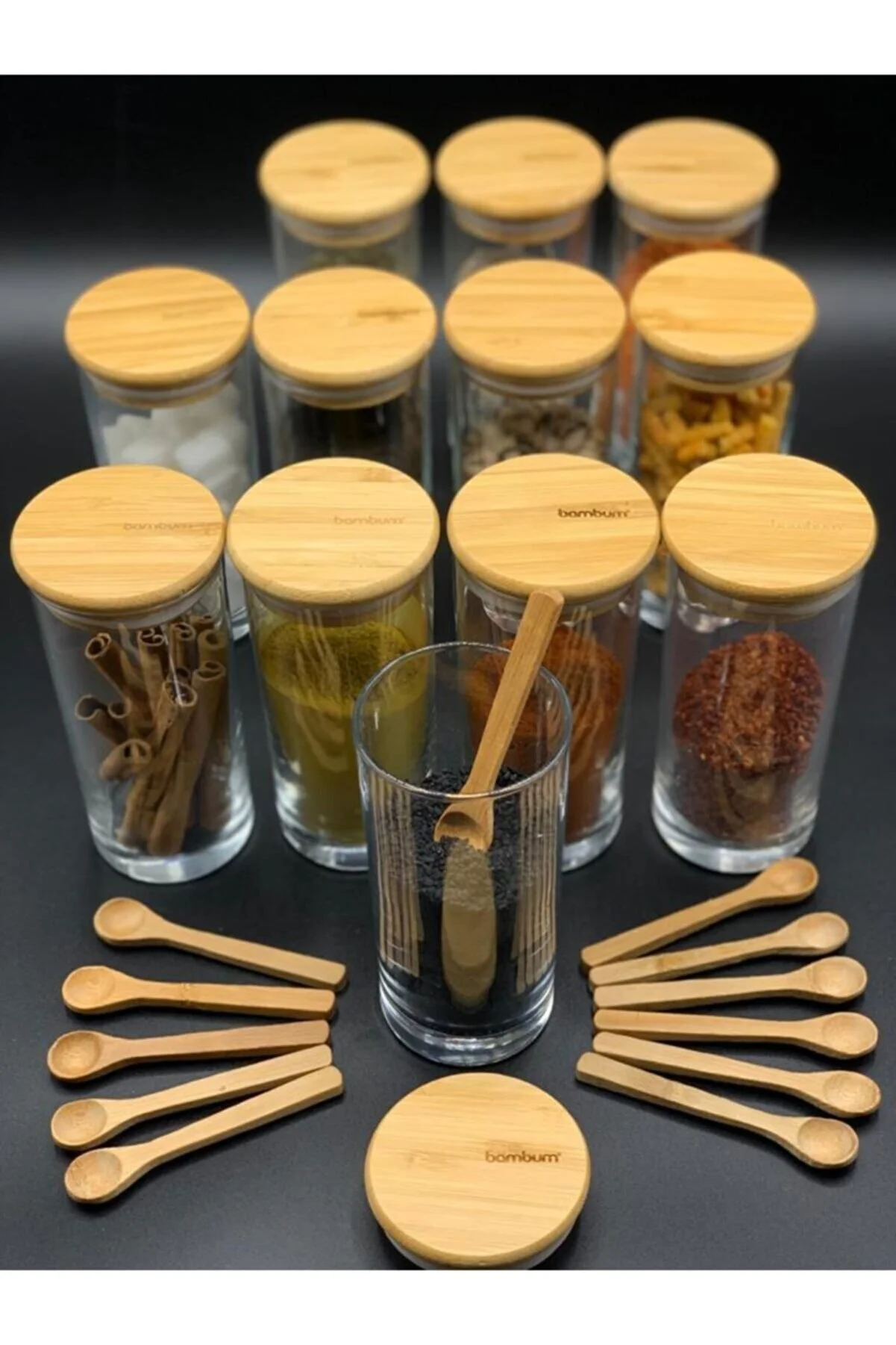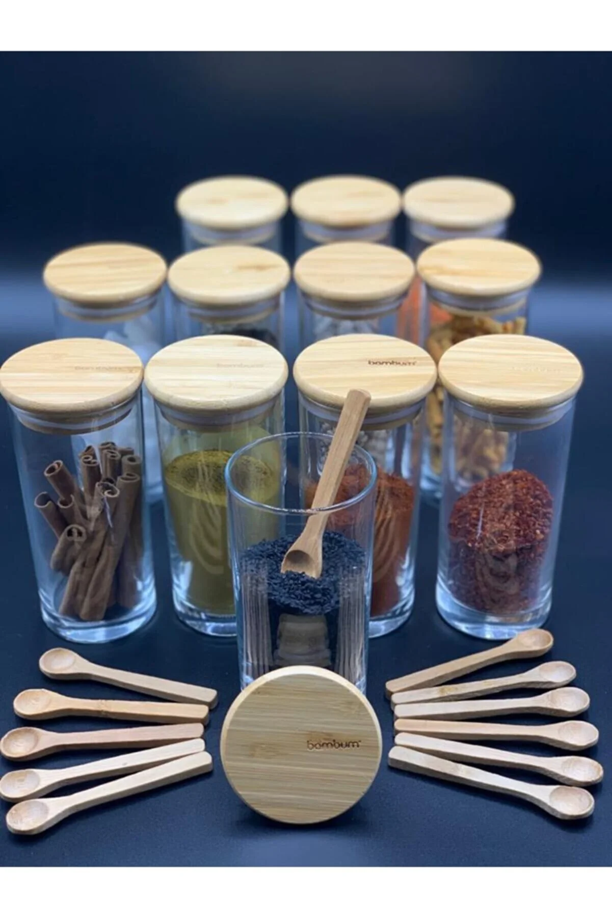 Set includes 12 Bambum 250 cc jars and 12 spice spoons