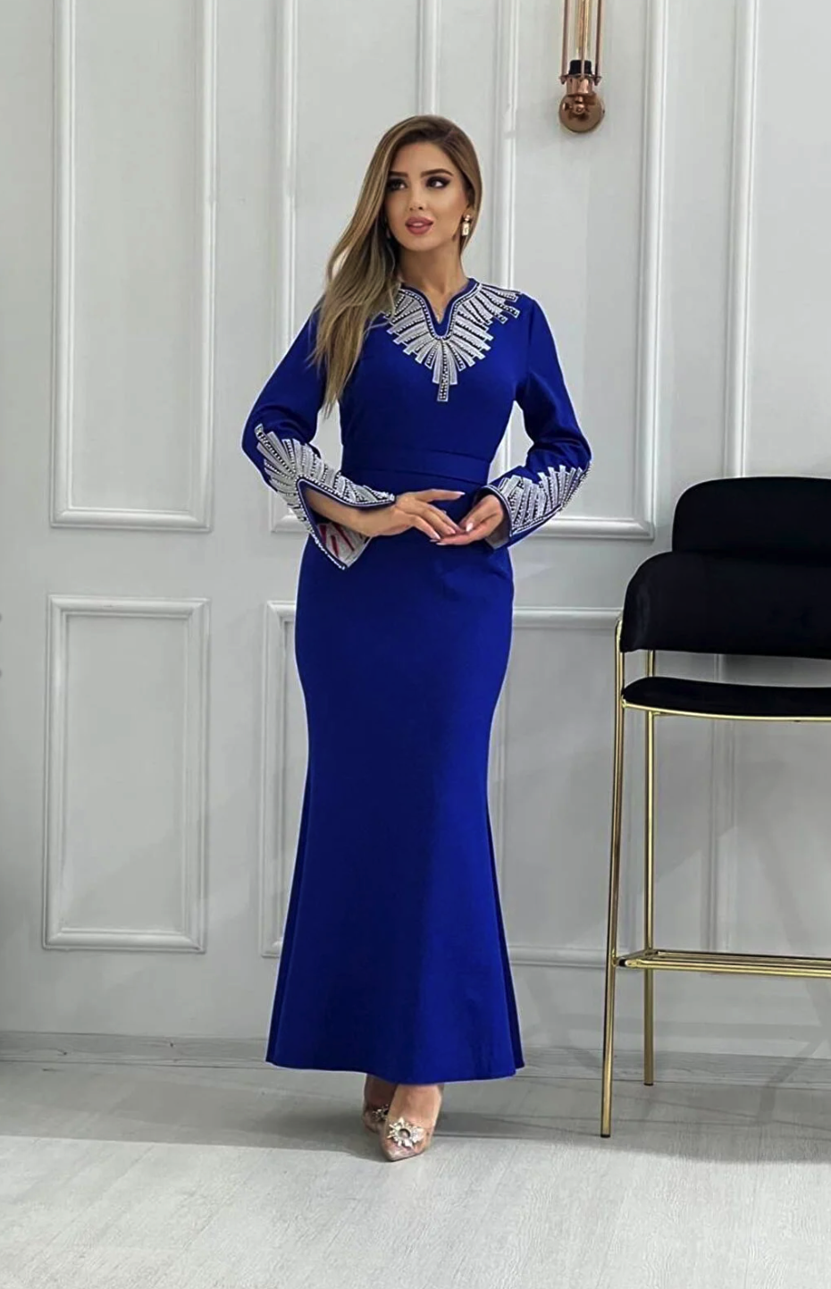 Product Dimensions Height: 145 cm Bust: 48 cm Hips: 49 cm Waist: 38 cm The product is unlined. It is V-neck. Embroidery and stone embroidery are available. 1. Made of quality double fabric. It has a belt. It has a zipper on the back. There may be a tonal difference in the product color due to the concept shots. Shooting sample is size 38.