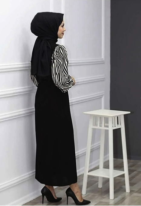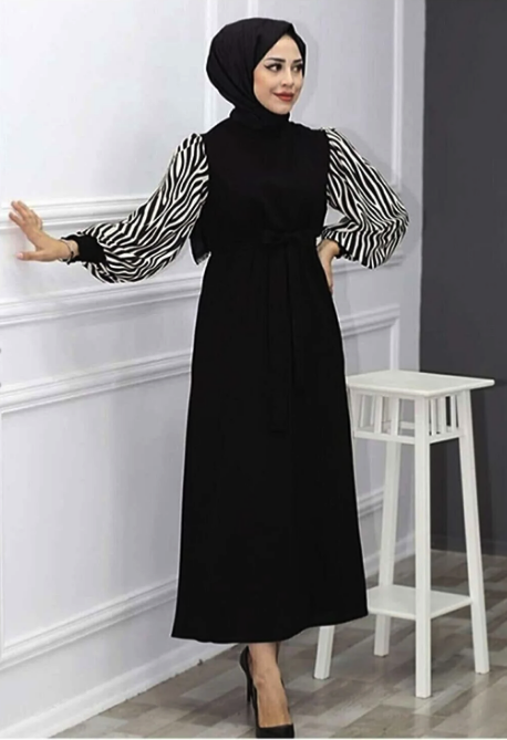 فستان أسود بأكمام طويله مع حزام راقي جدا ، صنع تركيا