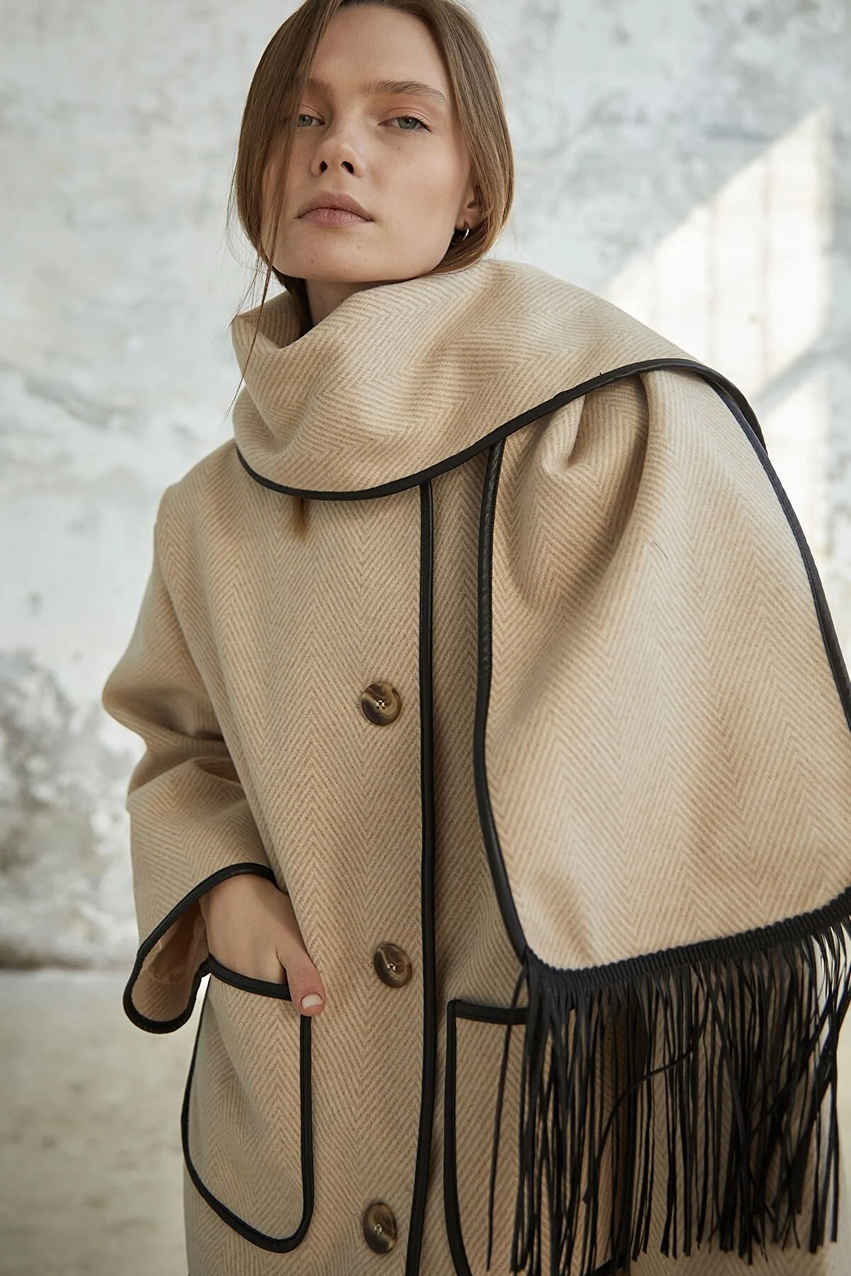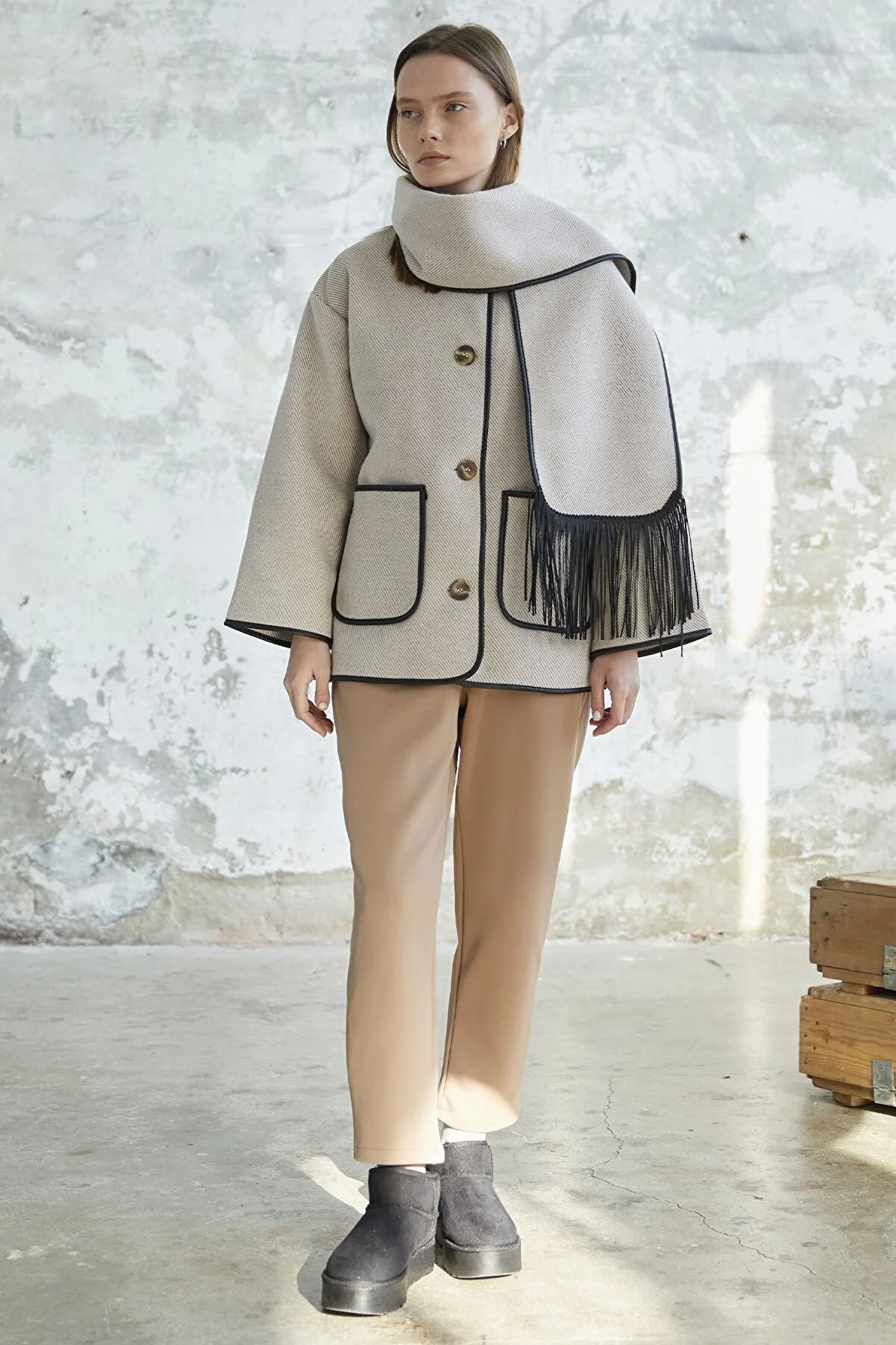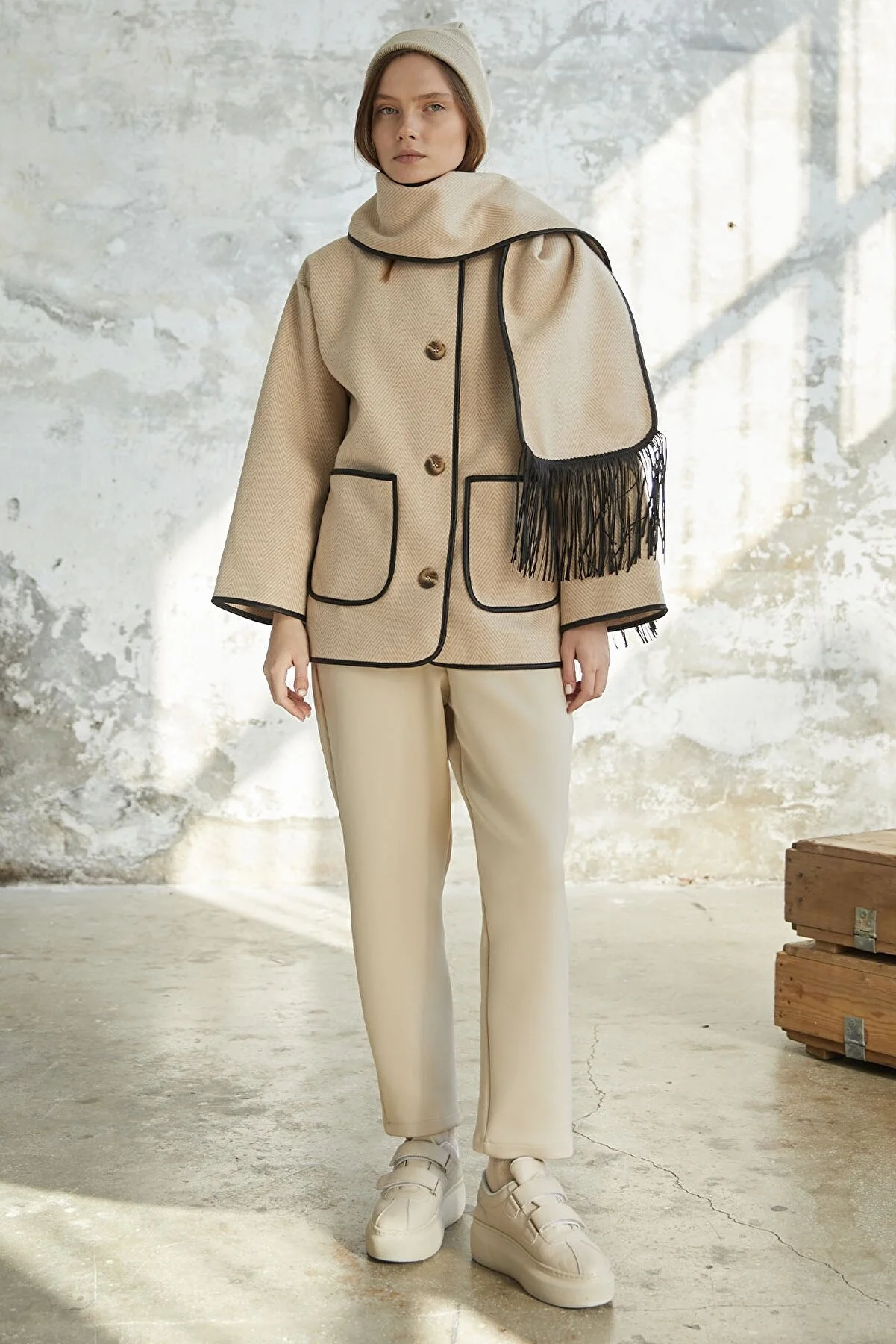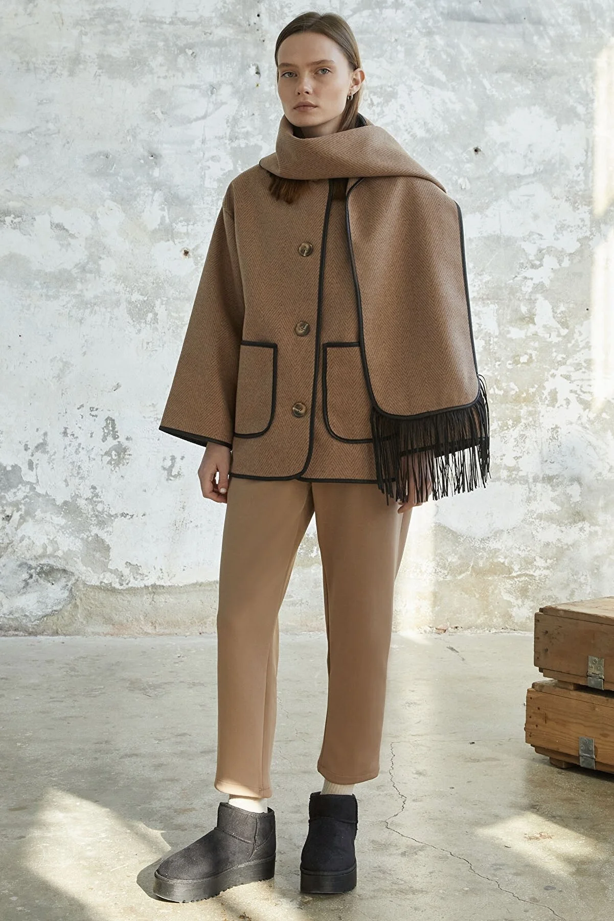 Elevate your winter wardrobe with the InStyle wool coat in a rich dark beige shade, featuring leather trim and a stylish bow detail (MS00MİS9859). Crafted from high-quality wool fabric, this coat is 70 cm in length and adorned with leather trim, adding a touch of sophistication. The coat comes with pockets, buttons for closure, and a chic striped design. The interior is lined for extra comfort. The accompanying scarf measures 174 cm in length and 50 cm in width. The model in the picture is 175 cm tall with measurements: Waist: 60 cm, Hips: 92 cm, Chest: 80 cm. The fabric composition is 100% polyester, ensuring both style and warmth for the colder seasons. Embrace elegance and warmth with this InStyle wool coat featuring leather detailing and a distinctive bow accent.
