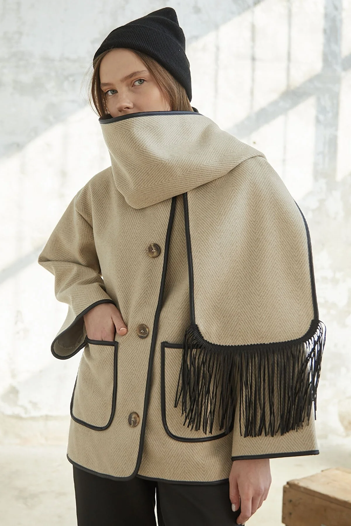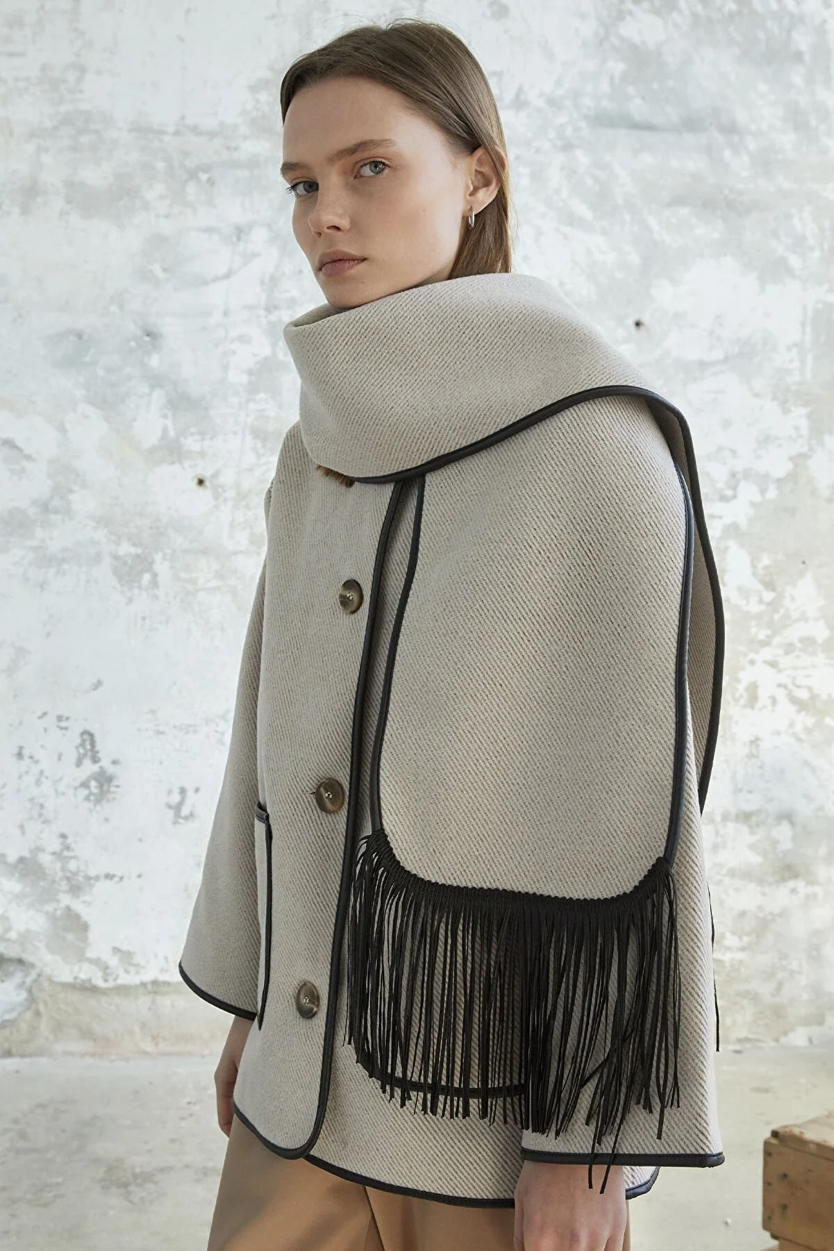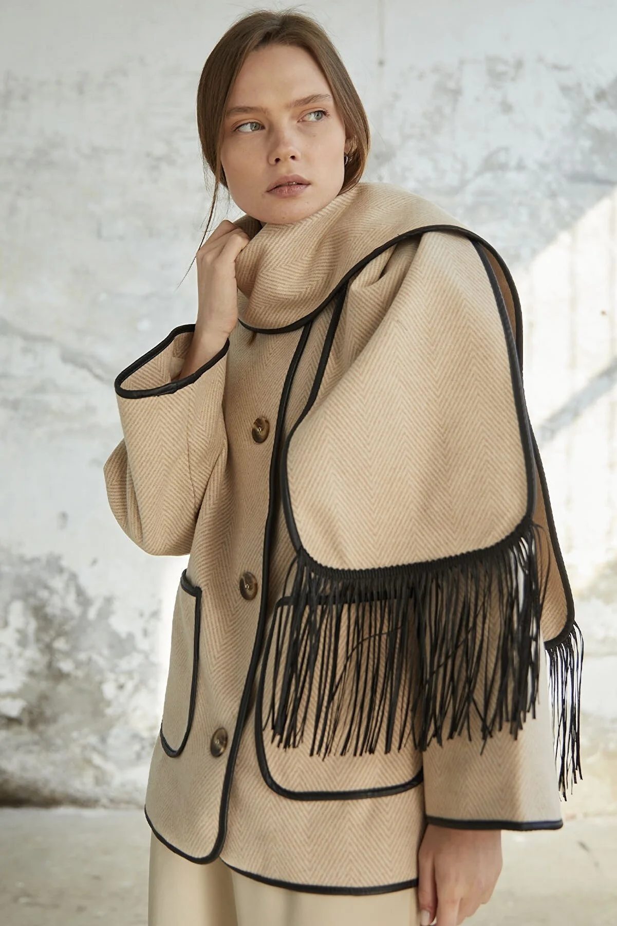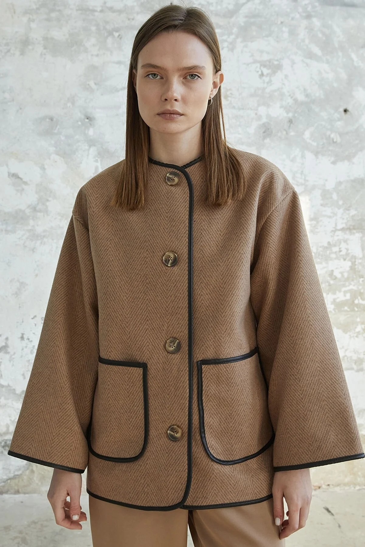 Elevate your winter wardrobe with the InStyle wool coat in a rich dark beige shade, featuring leather trim and a stylish bow detail (MS00MİS9859). Crafted from high-quality wool fabric, this coat is 70 cm in length and adorned with leather trim, adding a touch of sophistication. The coat comes with pockets, buttons for closure, and a chic striped design. The interior is lined for extra comfort. The accompanying scarf measures 174 cm in length and 50 cm in width. The model in the picture is 175 cm tall with measurements: Waist: 60 cm, Hips: 92 cm, Chest: 80 cm. The fabric composition is 100% polyester, ensuring both style and warmth for the colder seasons. Embrace elegance and warmth with this InStyle wool coat featuring leather detailing and a distinctive bow accent.