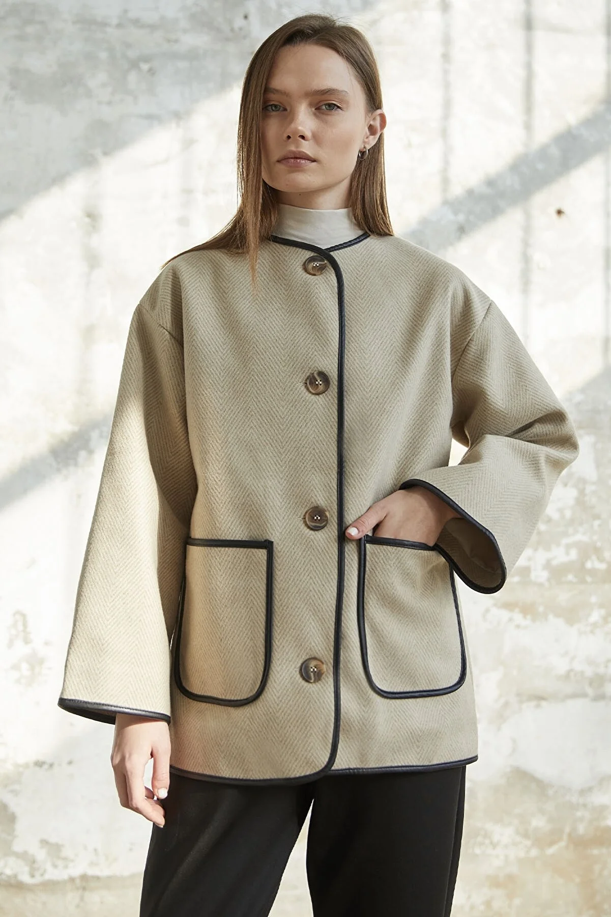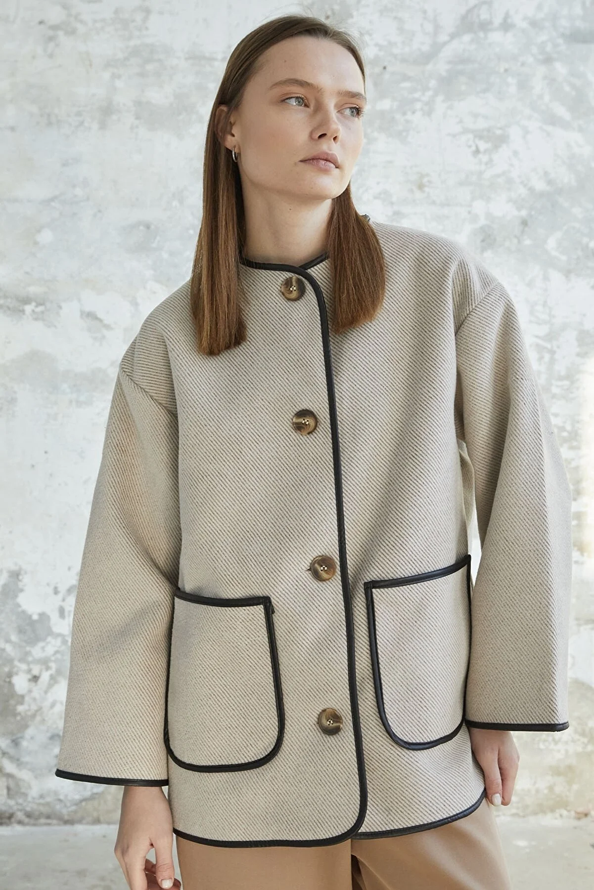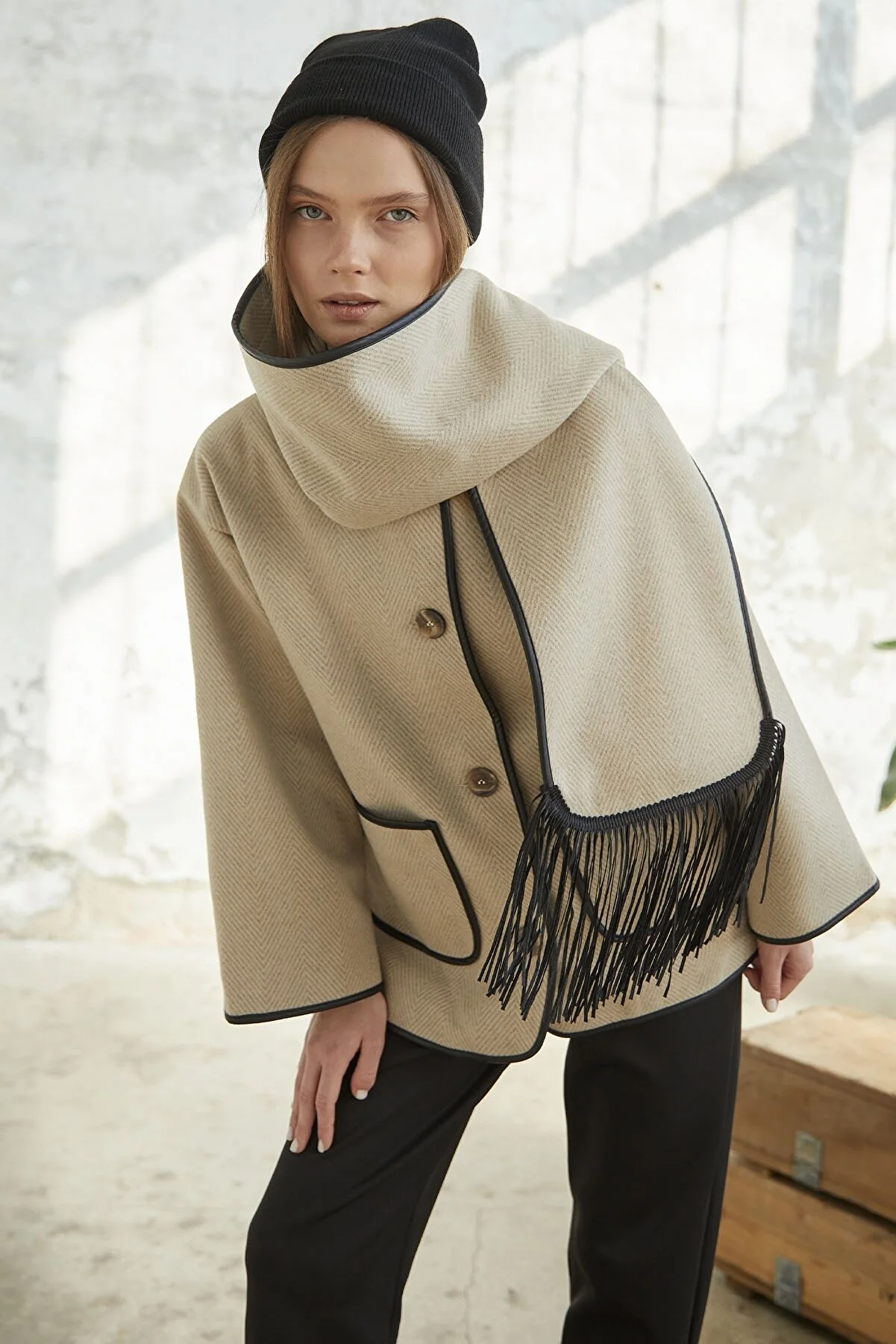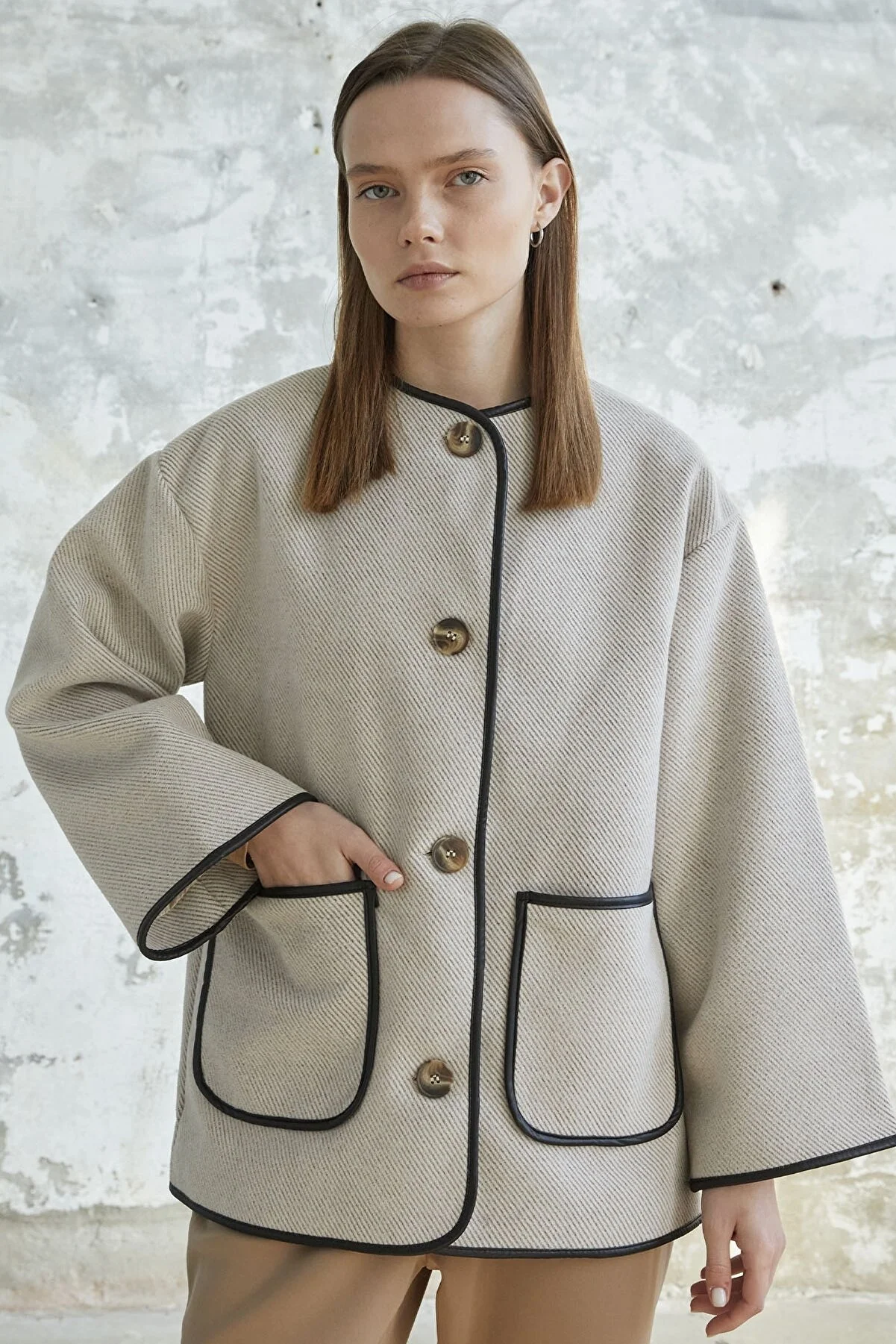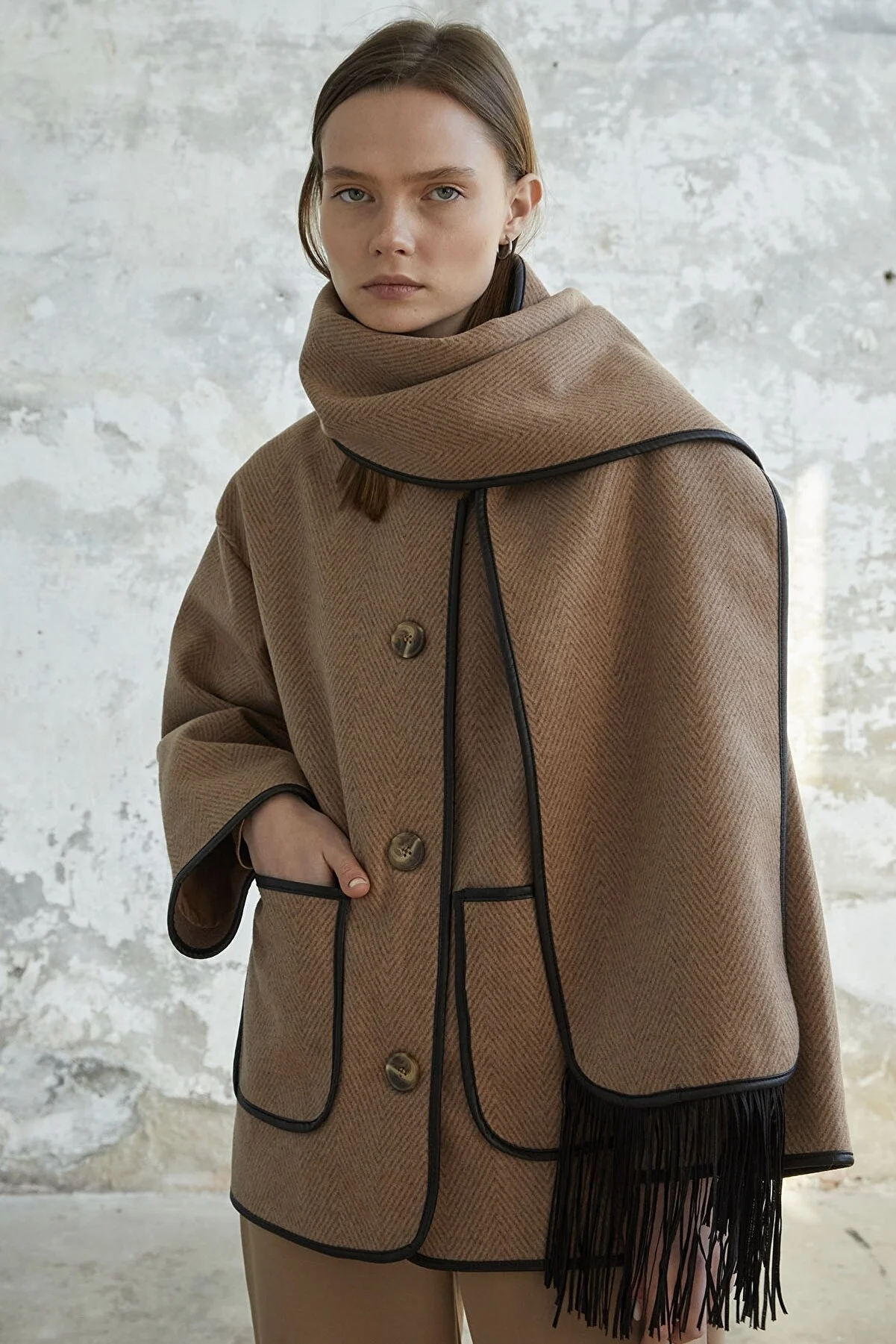 Elevate your winter wardrobe with the InStyle wool coat in a rich dark beige shade, featuring leather trim and a stylish bow detail (MS00MİS9859). Crafted from high-quality wool fabric, this coat is 70 cm in length and adorned with leather trim, adding a touch of sophistication. The coat comes with pockets, buttons for closure, and a chic striped design. The interior is lined for extra comfort. The accompanying scarf measures 174 cm in length and 50 cm in width. The model in the picture is 175 cm tall with measurements: Waist: 60 cm, Hips: 92 cm, Chest: 80 cm. The fabric composition is 100% polyester, ensuring both style and warmth for the colder seasons. Embrace elegance and warmth with this InStyle wool coat featuring leather detailing and a distinctive bow accent.
