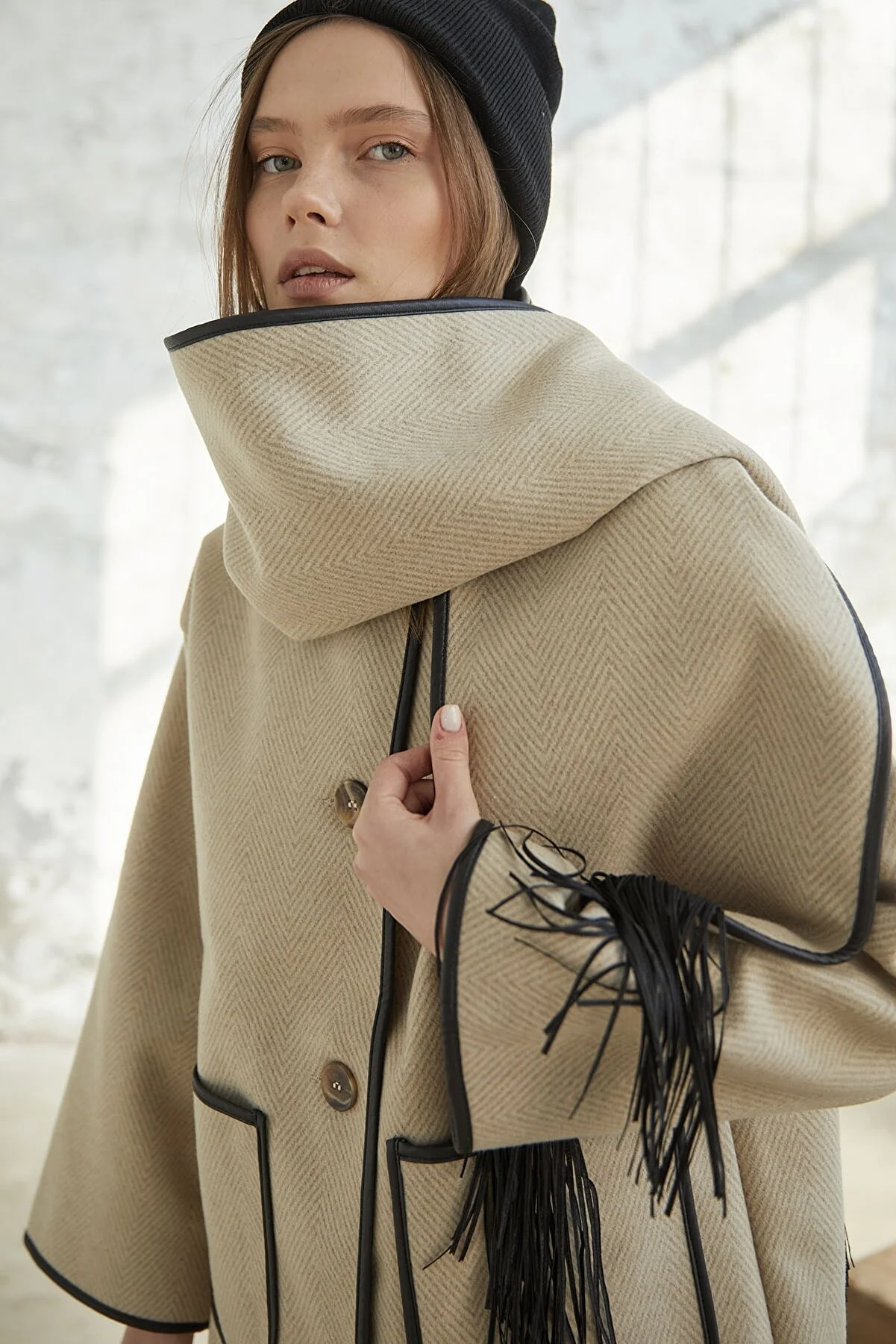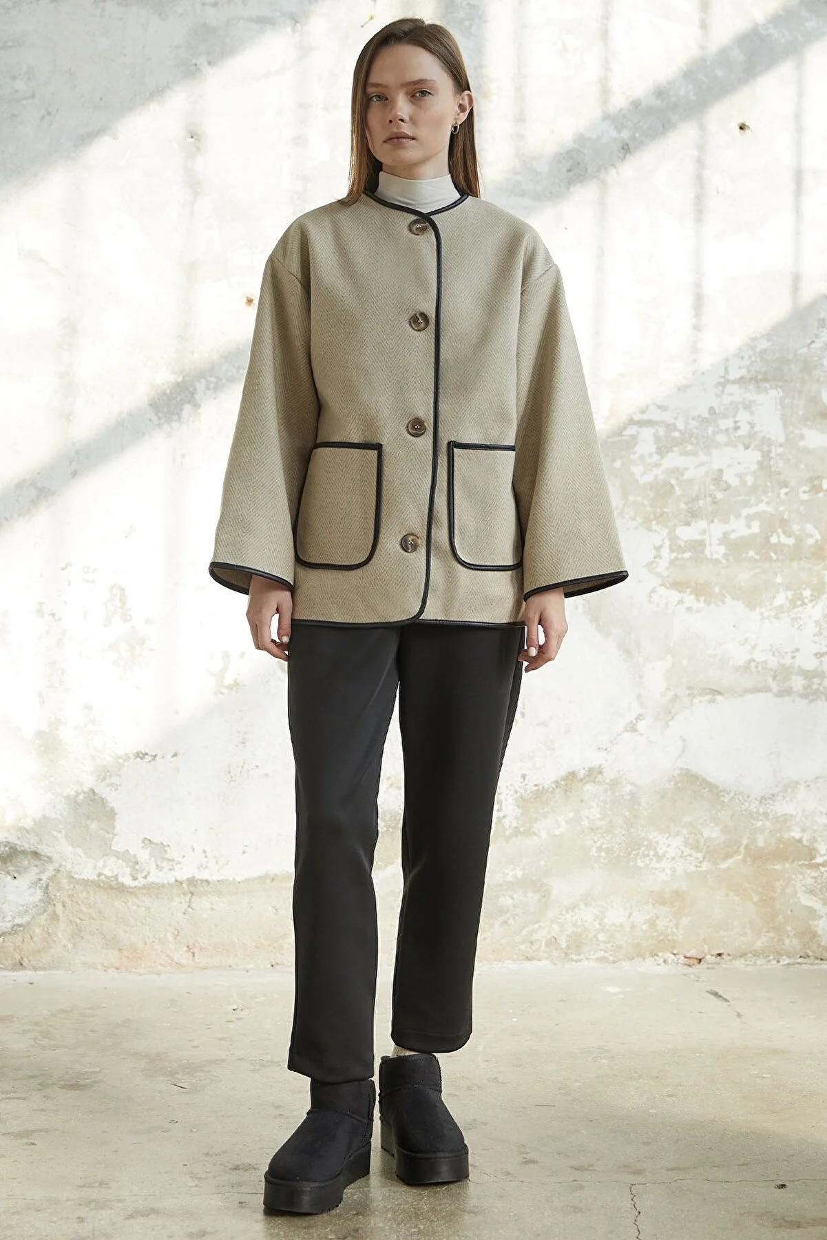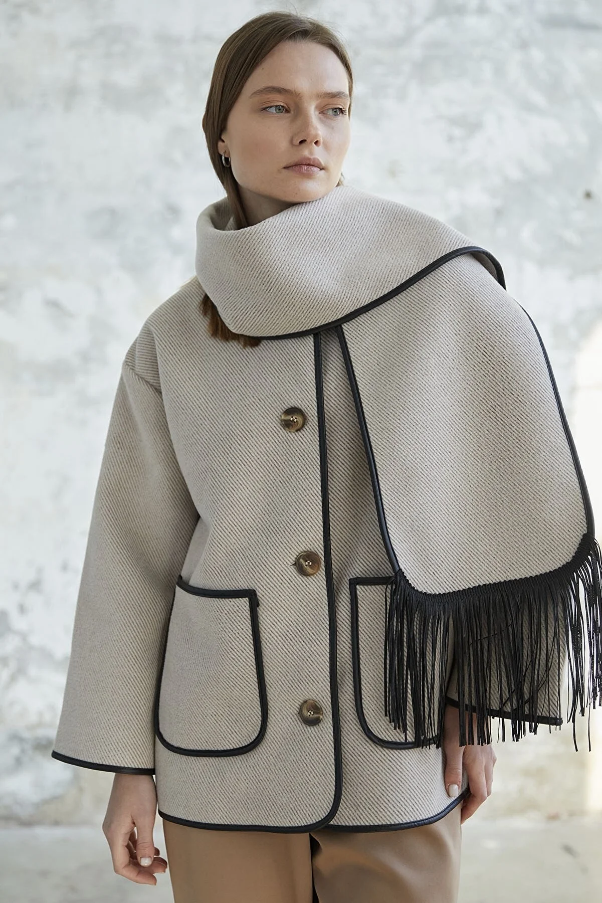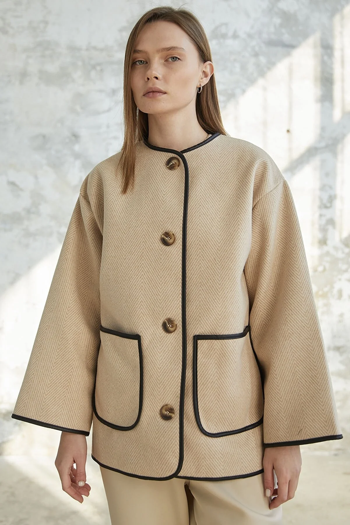 Elevate your winter wardrobe with the InStyle wool coat in a rich dark beige shade, featuring leather trim and a stylish bow detail (MS00MİS9859). Crafted from high-quality wool fabric, this coat is 70 cm in length and adorned with leather trim, adding a touch of sophistication. The coat comes with pockets, buttons for closure, and a chic striped design. The interior is lined for extra comfort. The accompanying scarf measures 174 cm in length and 50 cm in width. The model in the picture is 175 cm tall with measurements: Waist: 60 cm, Hips: 92 cm, Chest: 80 cm. The fabric composition is 100% polyester, ensuring both style and warmth for the colder seasons. Embrace elegance and warmth with this InStyle wool coat featuring leather detailing and a distinctive bow accent.