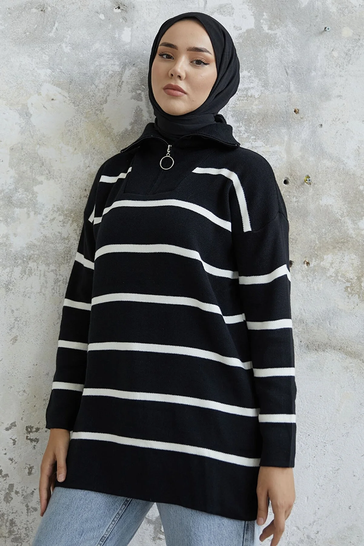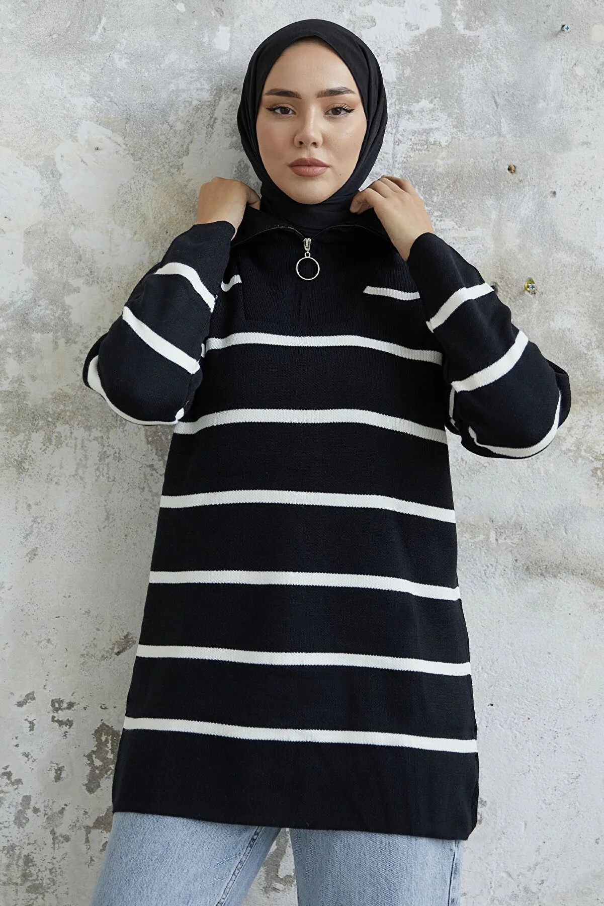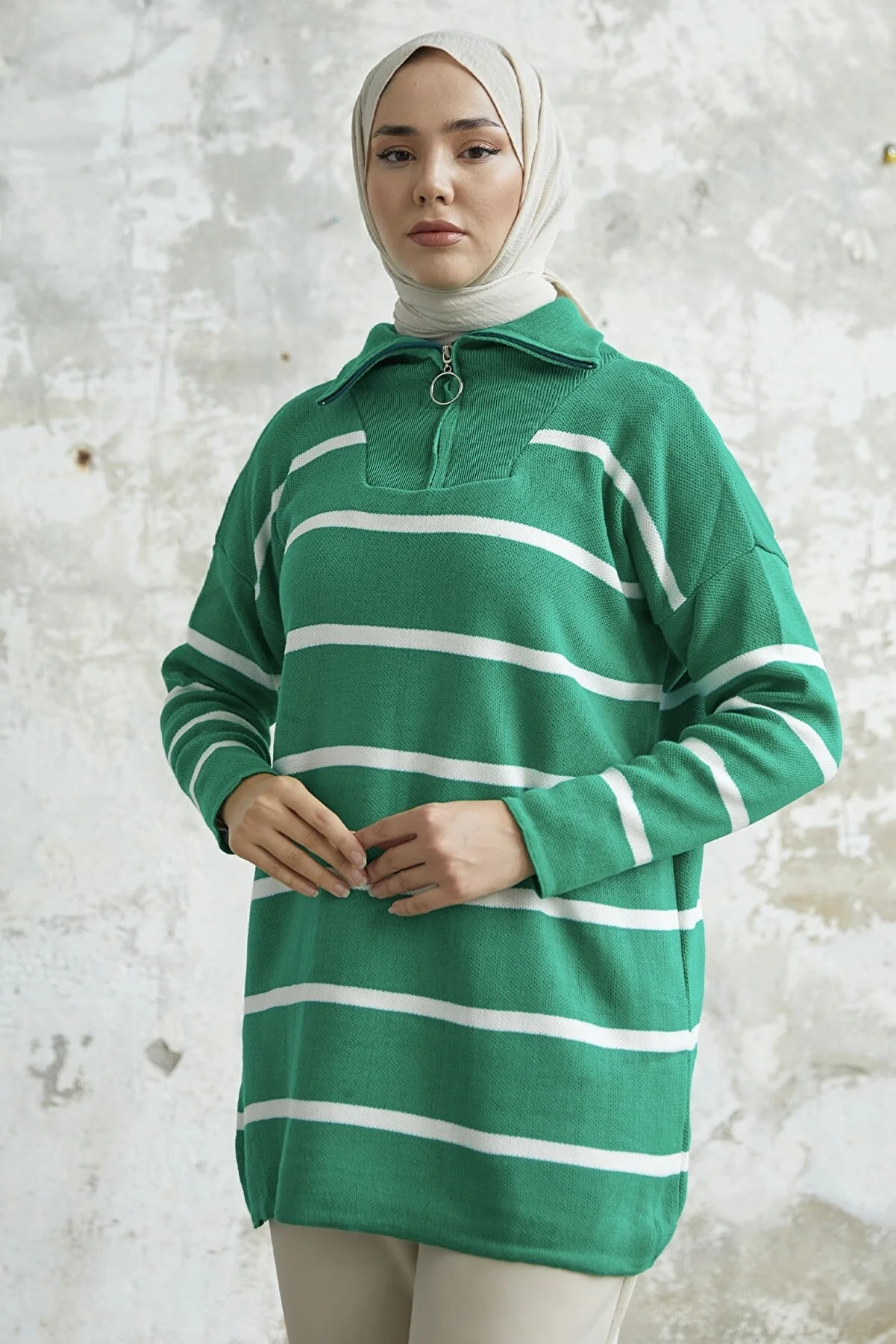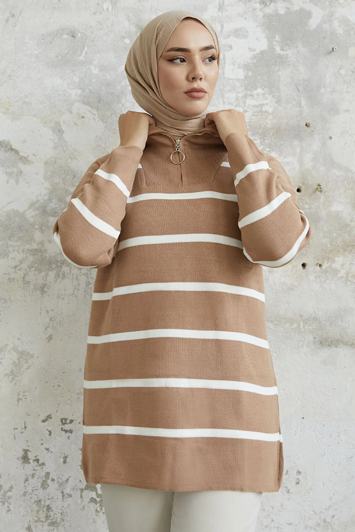 Made from knit fabric, featuring a zippered front and striped pattern.