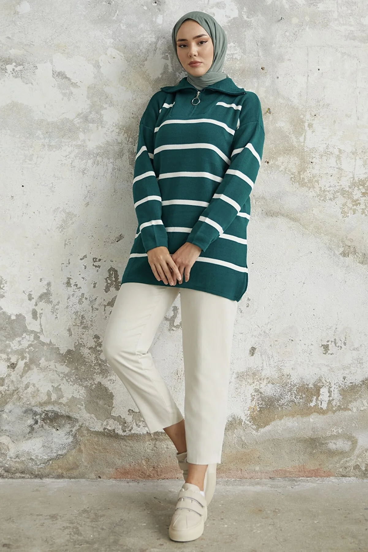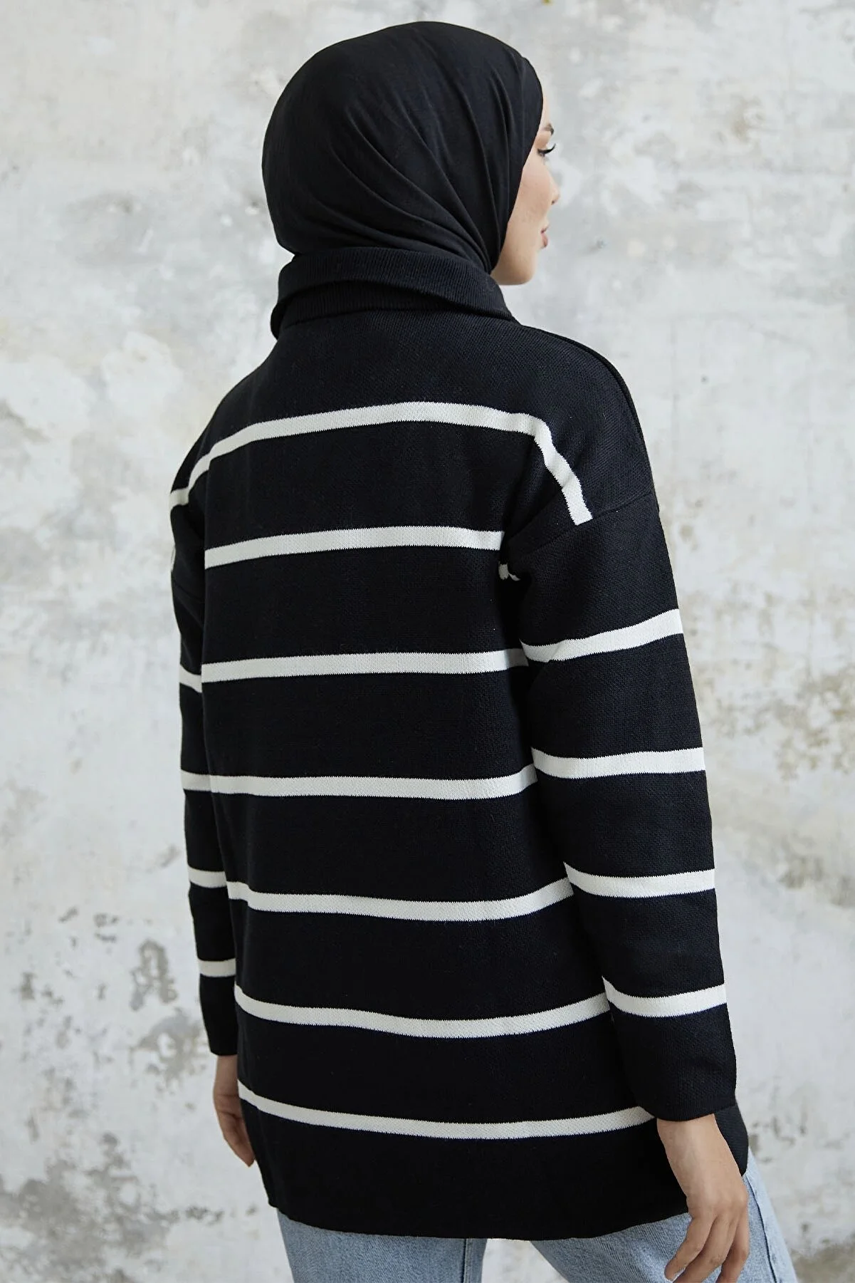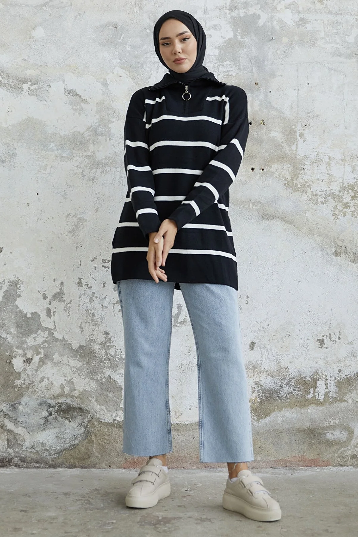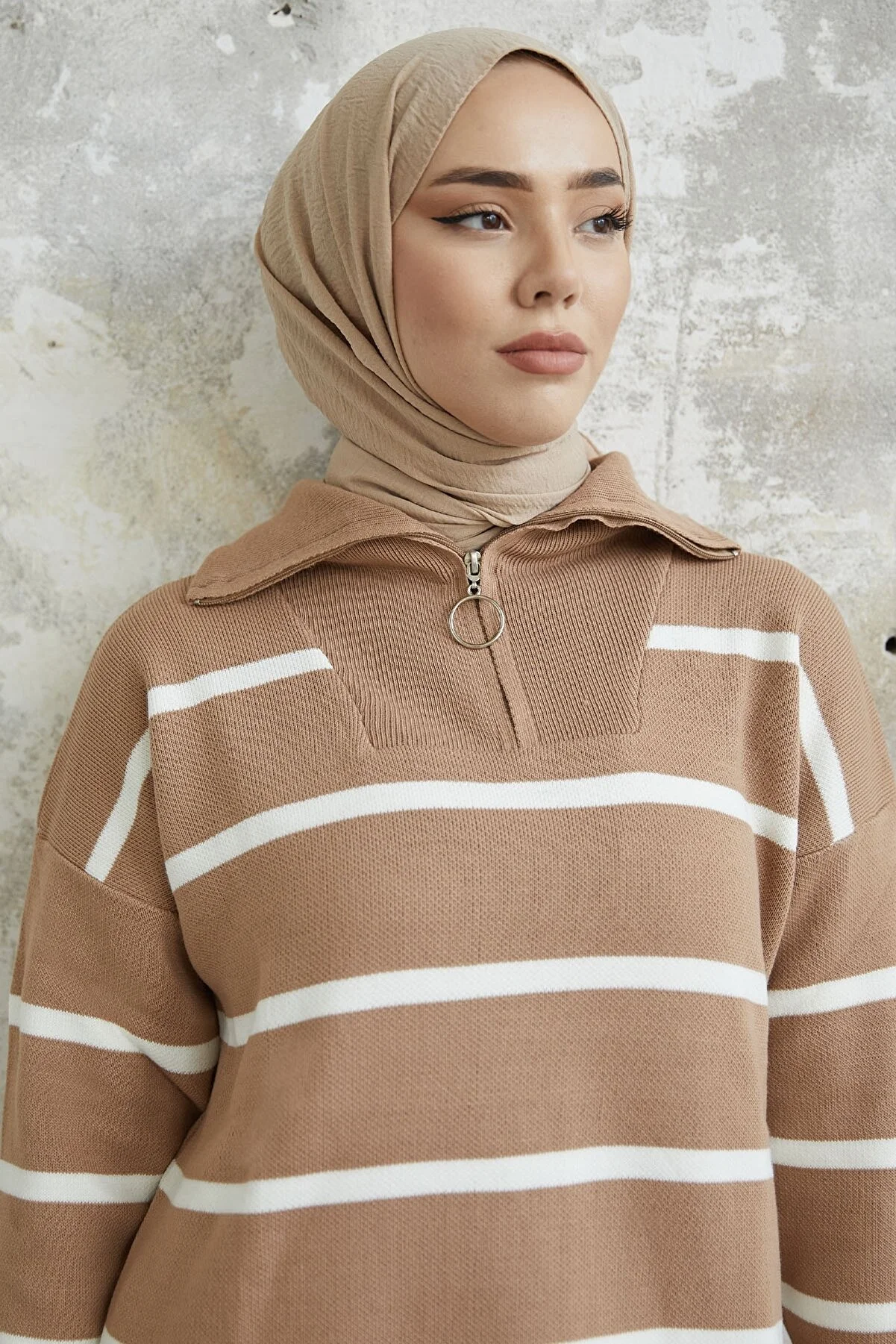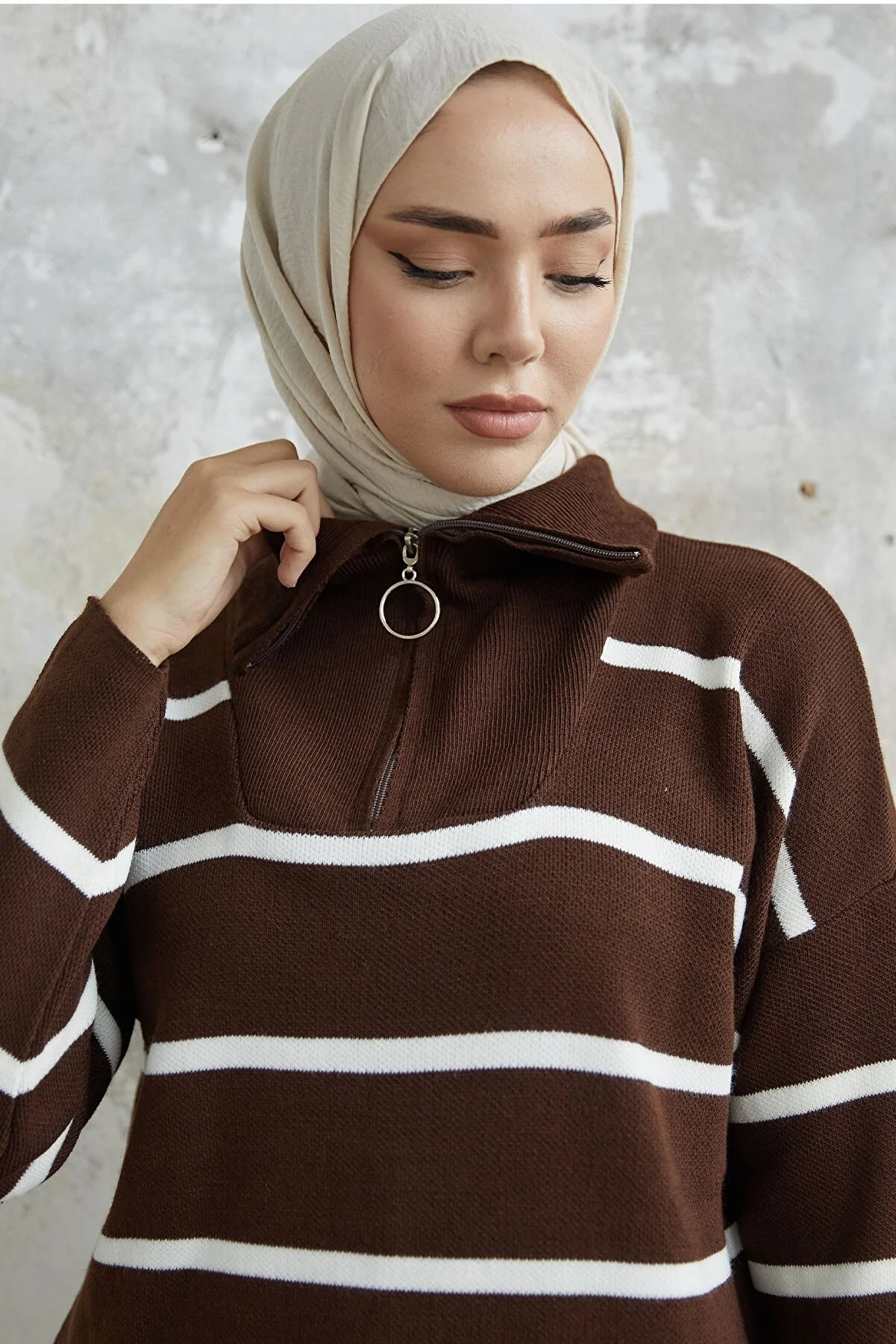 Made from knit fabric, featuring a zippered front and striped pattern.
