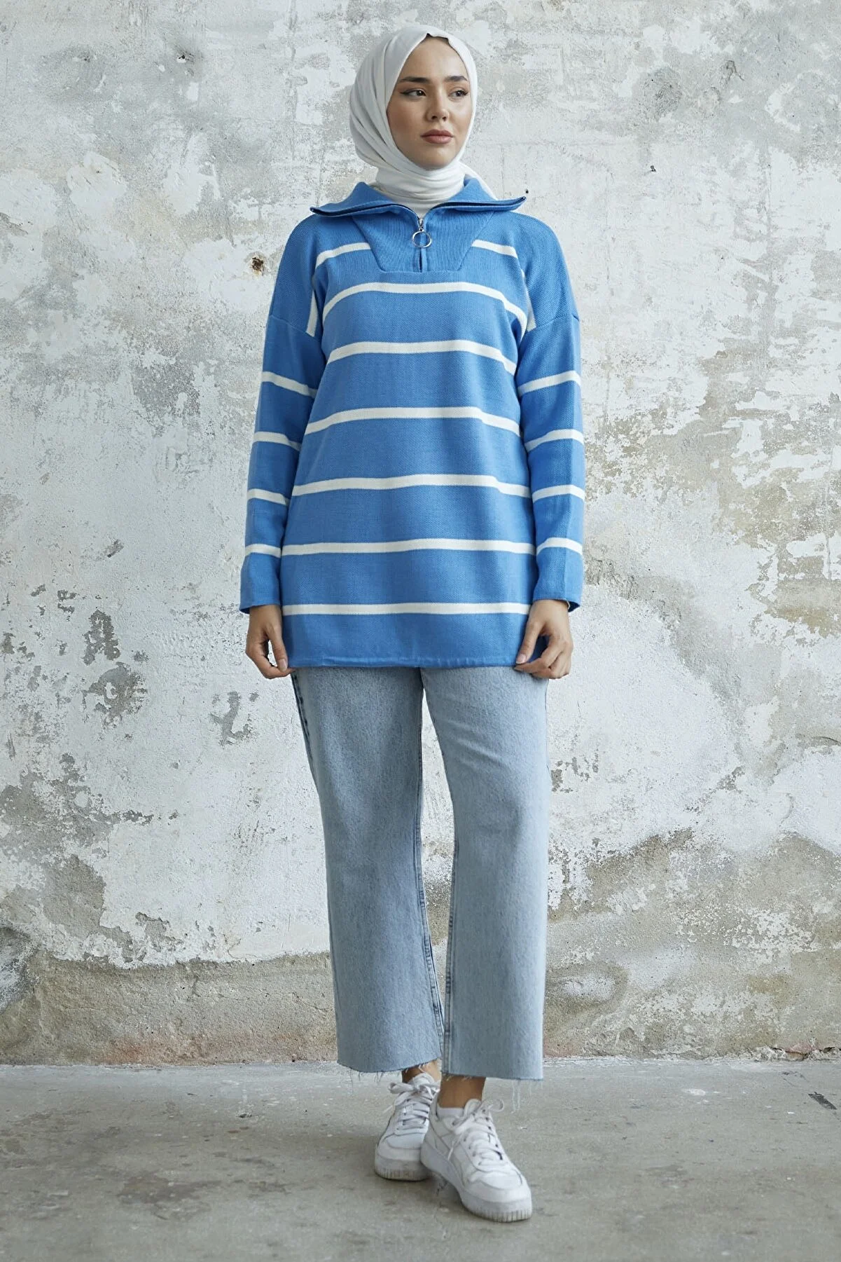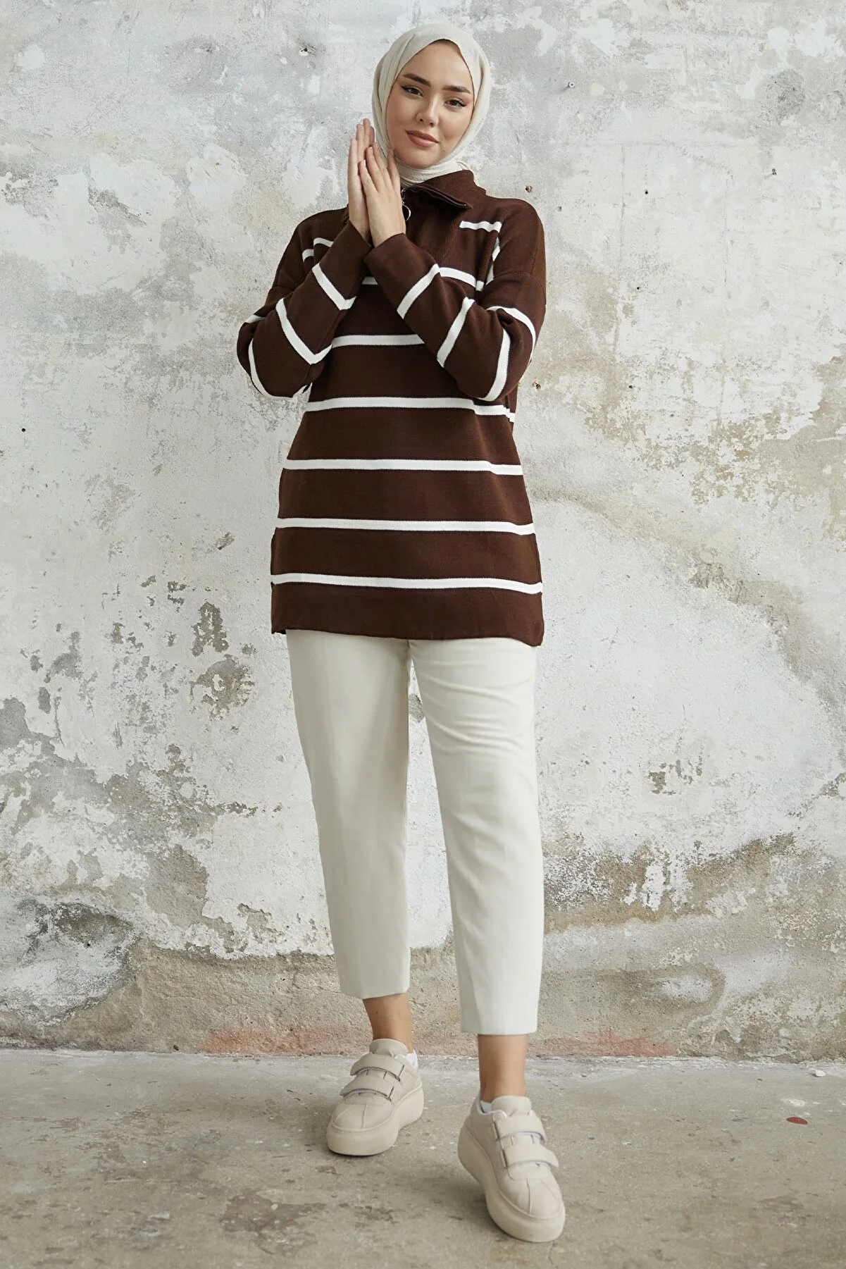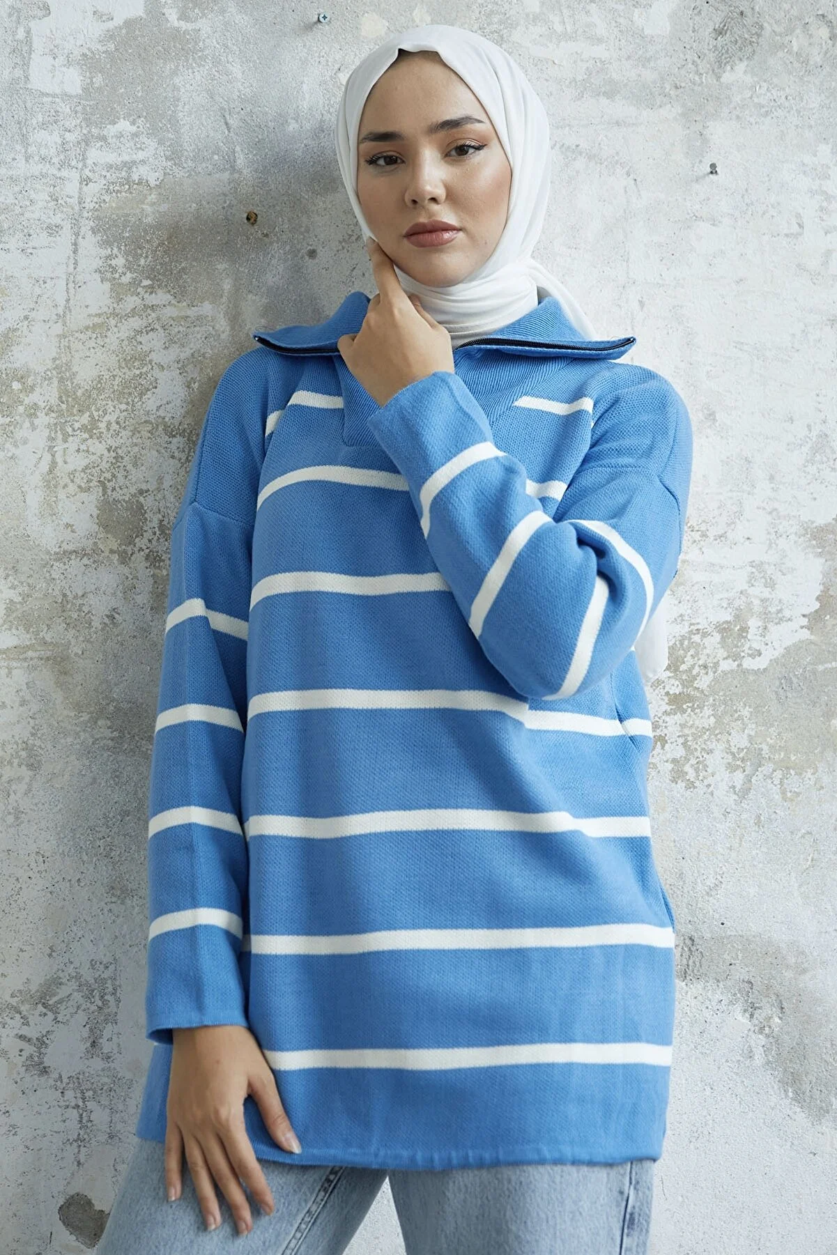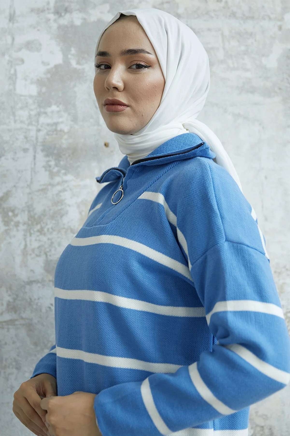 Made from knit fabric, featuring a zippered front and striped pattern.
