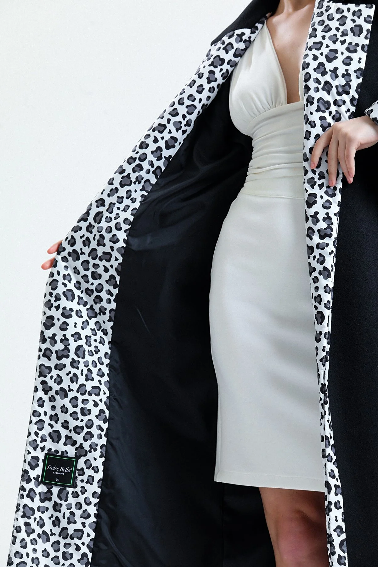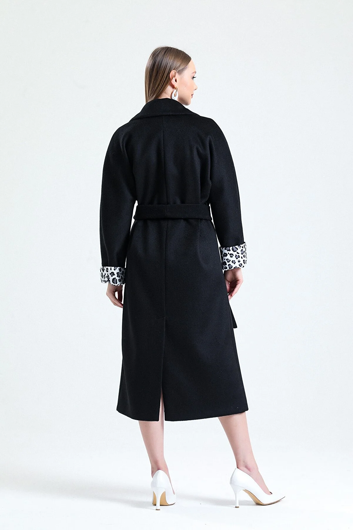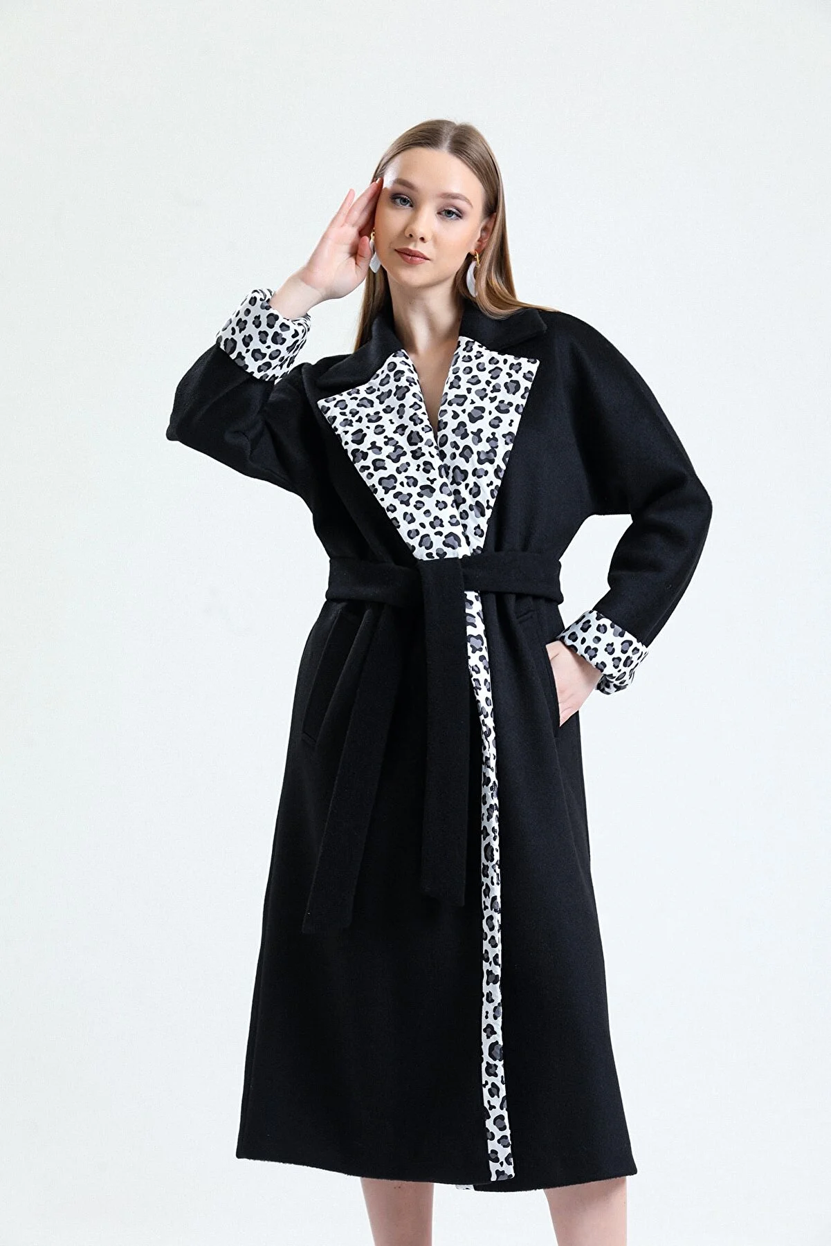 This women's coat is designed with a trendy leopard print, a double-breasted closure, and a shawl collar. It is made from wool, making it suitable for colder weather with its thick fabric. The coat features a belt to cinch the waist for a flattering fit. It has two pockets and is available in a long length. Please note that specific sizing information, care instructions, and other details may be available when purchasing the product.