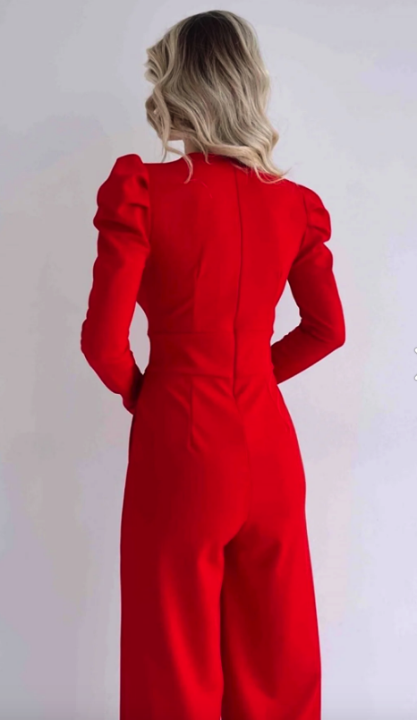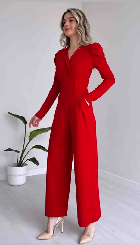 فستان سهرة أحمر بأرجل واسعة وأكمام طويلة وأزرار من قماش مطاطي من lovebox 029