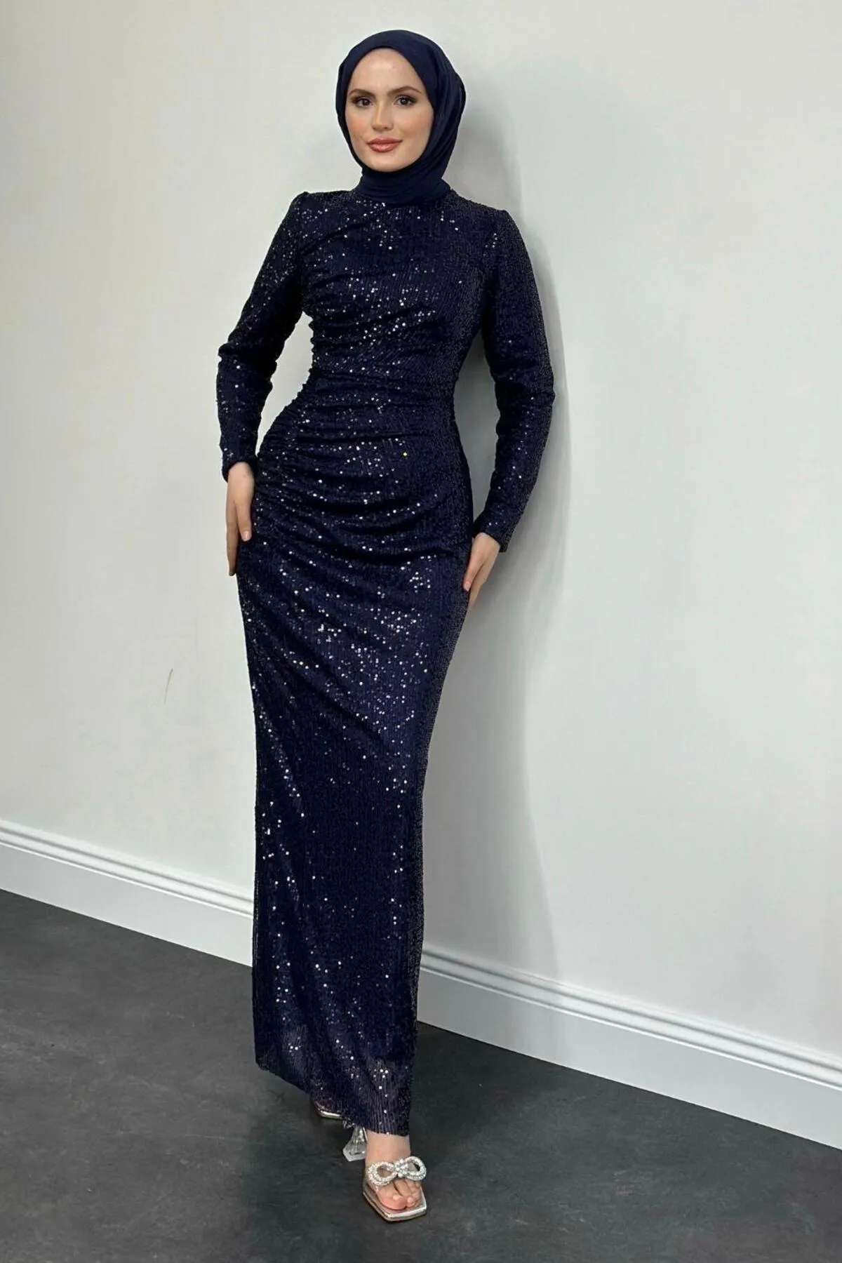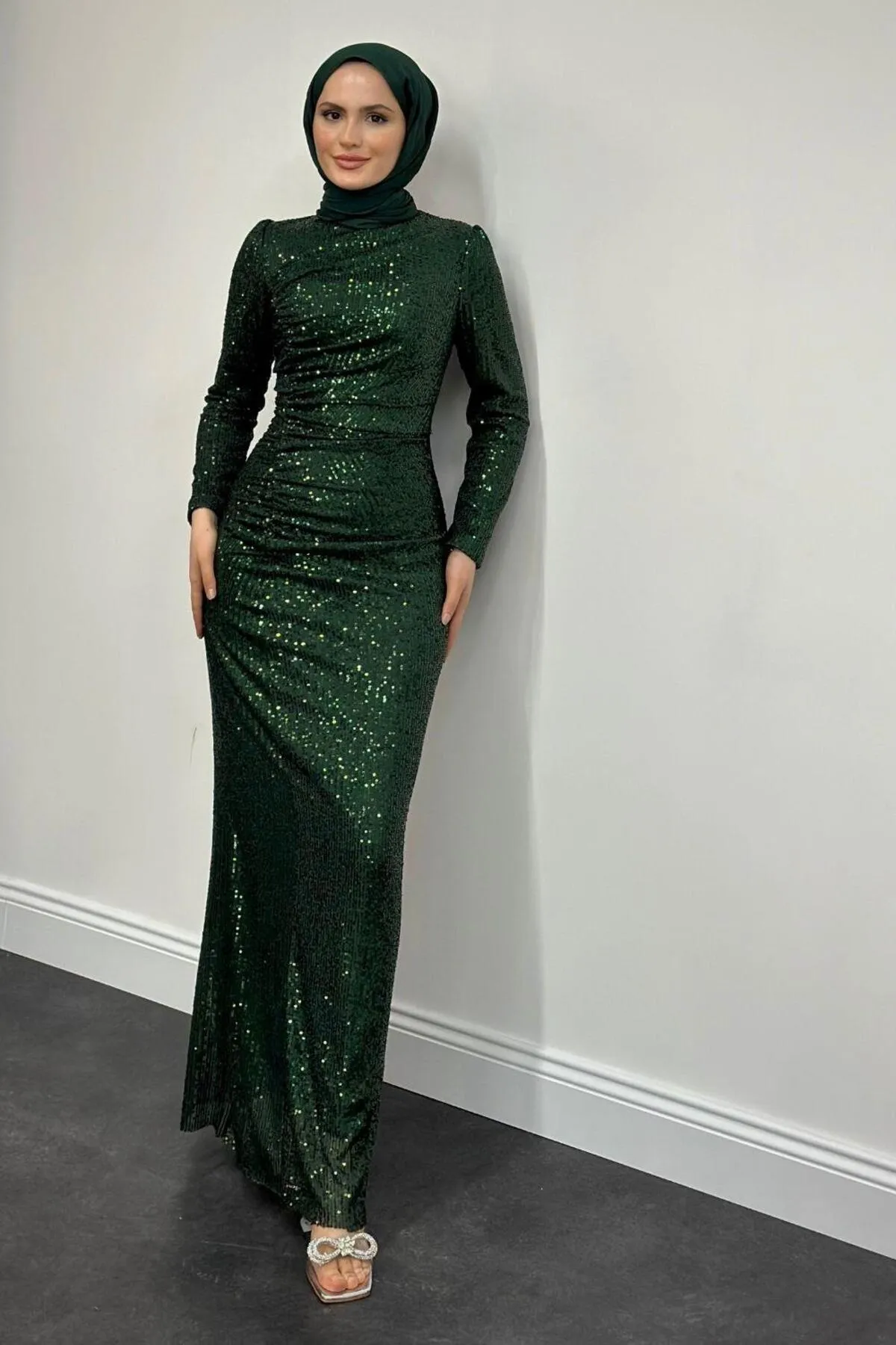 Mesmerizing sequin fabric and ruched design make this MervenakyuzCharles evening gown a statement piece.