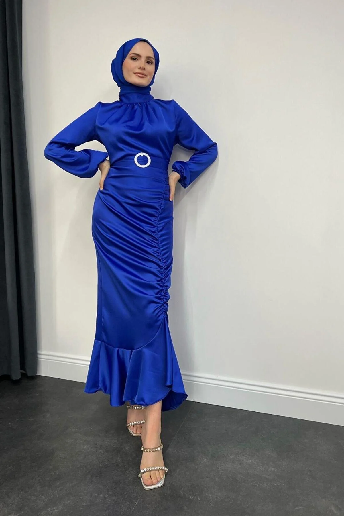 Elevate your style with the Mervenakyuz Satin Evening Gown, featuring a stylish fishtail cut and ruched detailing.