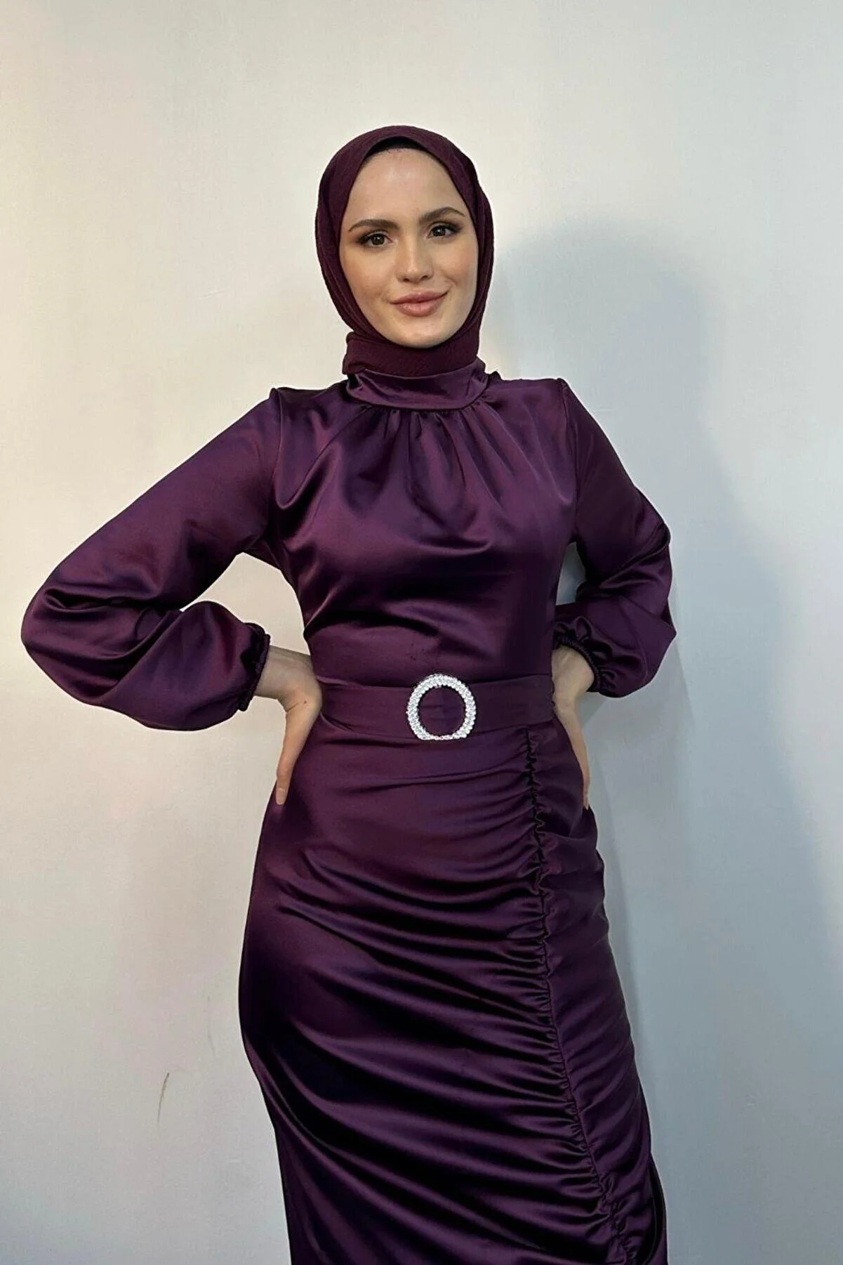 Mervenakyuz Ruched Belted Satin Evening Gown in Purple