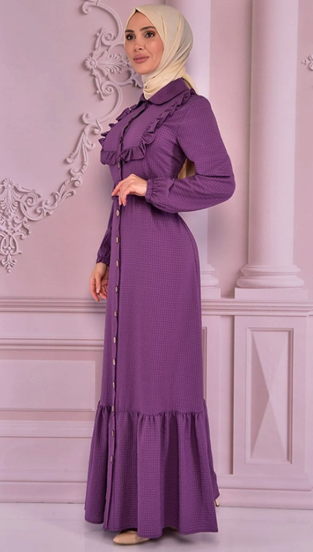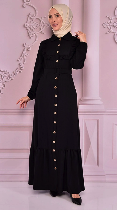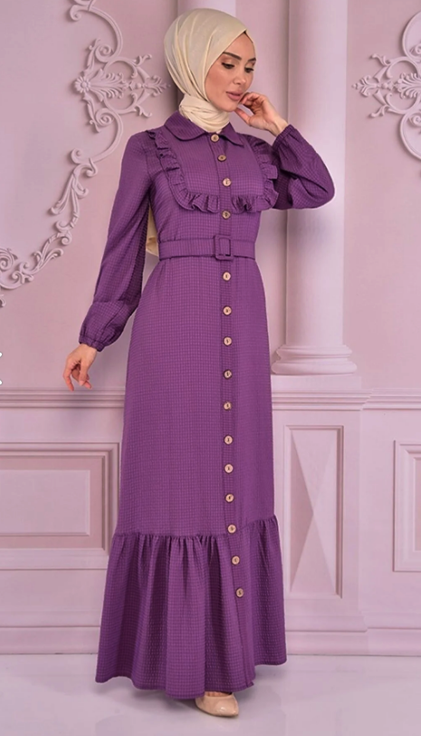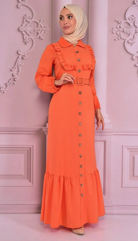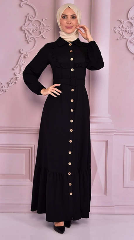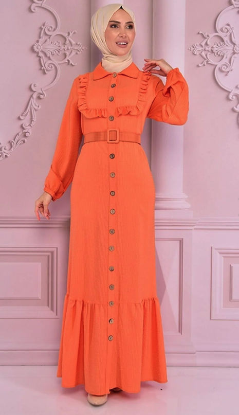 Fabric Feature: The product is produced from half lycra crepe fabric. Product Length: 154 cm. Product Feature: The product is a summer season product. It should have an active button from the neck. Frill detail is used on the front. Elastic on the sleeve cuffs. The belt is portable and is supplied with the product. Model Dimensions Height: 1.68 (Without Shoes) Bust: 87 Waist: 67 Hips: 95 The product on the mannequin is size 40. NOTE : The product pattern is a one-to-one pattern, it is recommended to order your own size. There may be slight tonal differences in product colors due to concept shots.