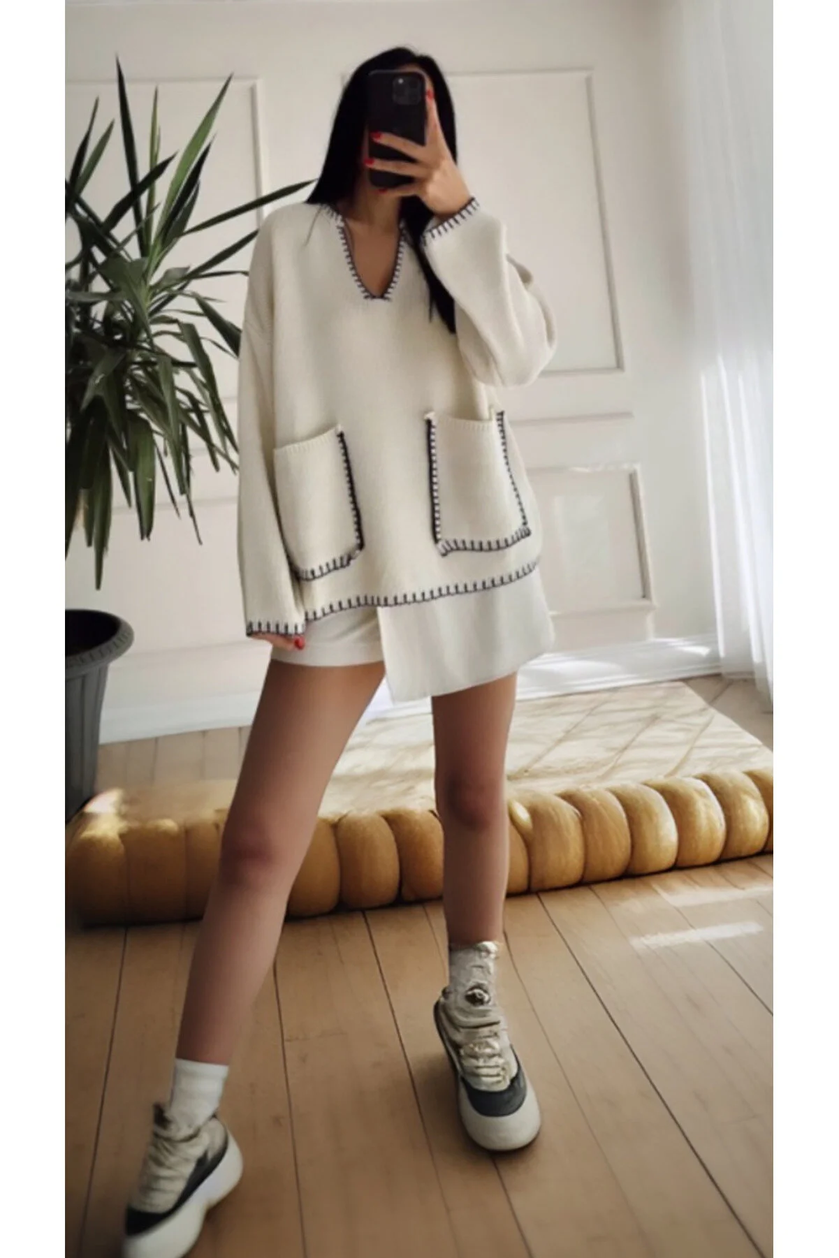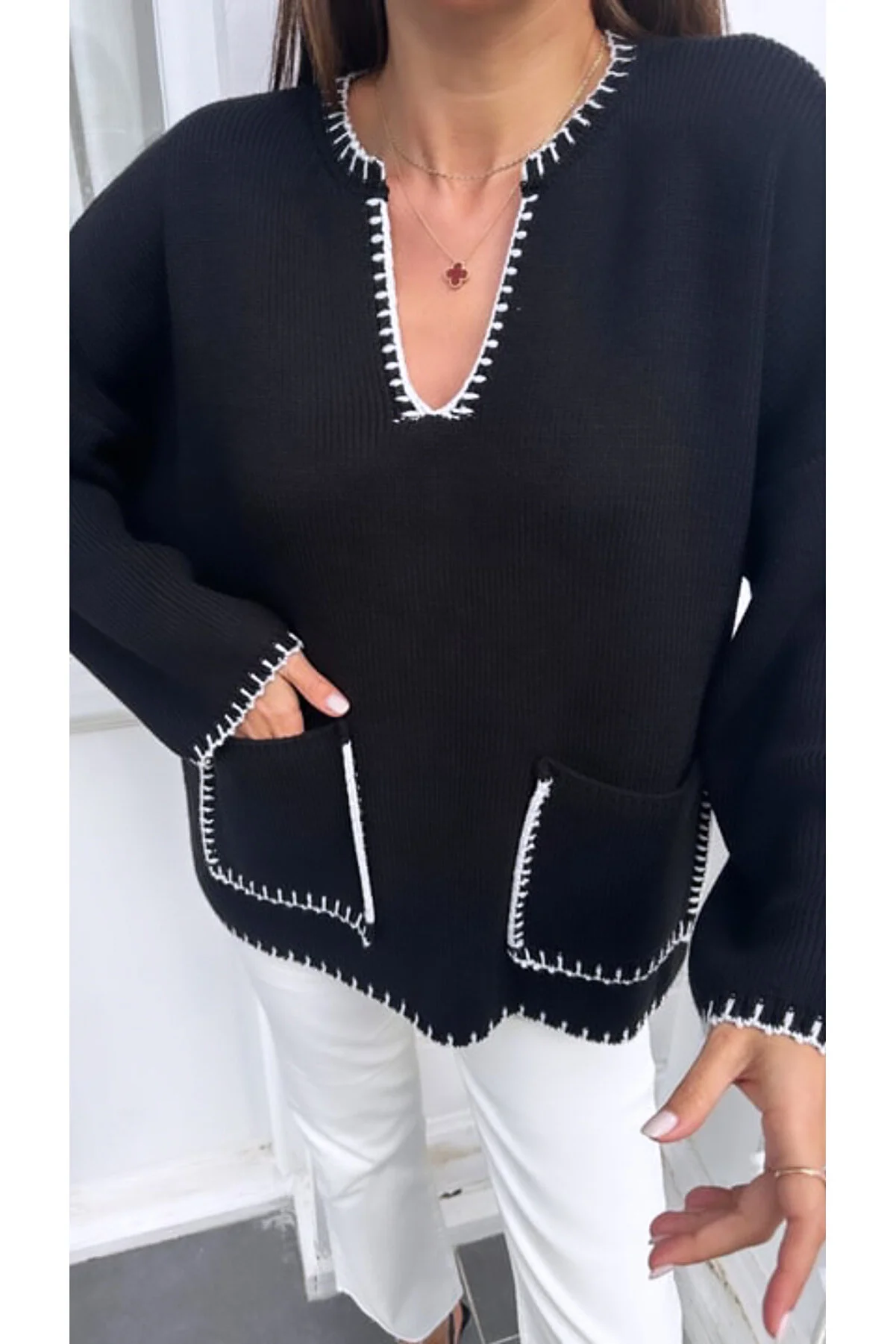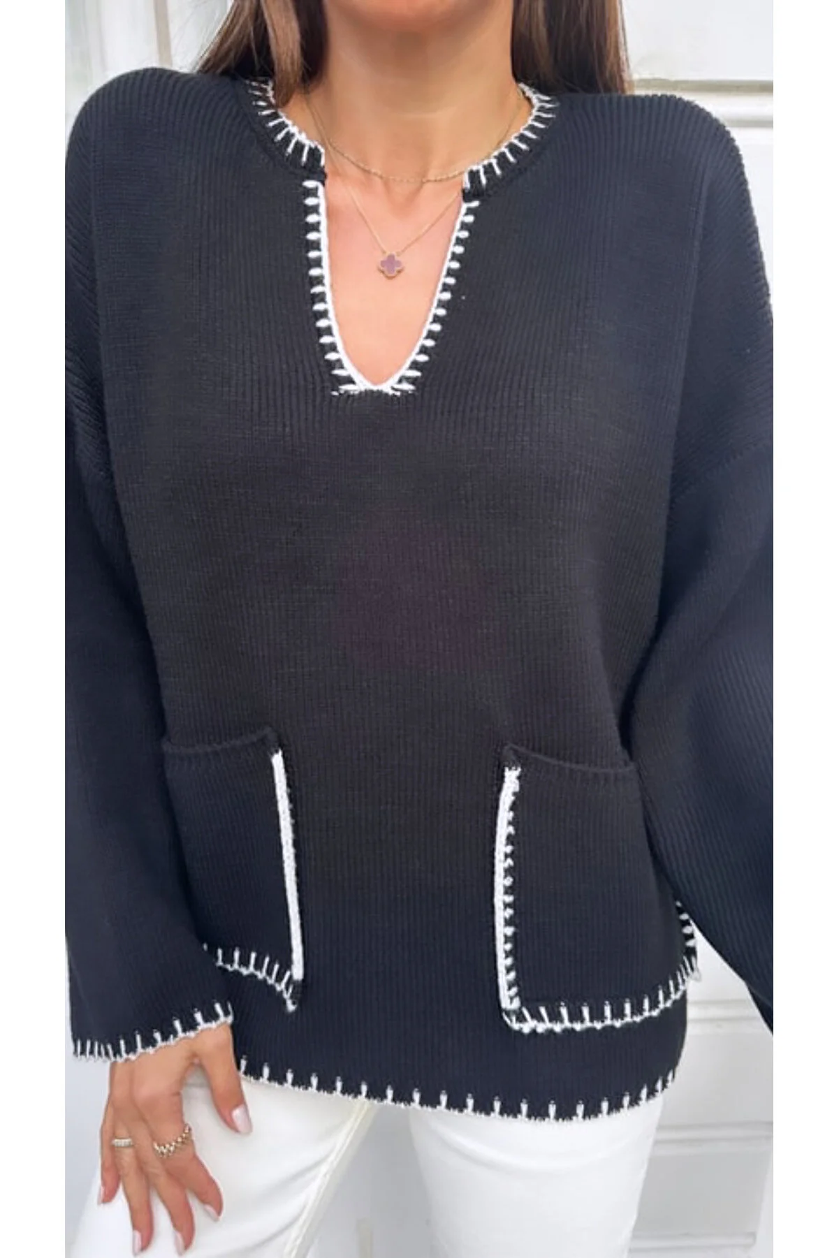 NILZA Women's Oversize Shepherd Stitched Double Pocket Sweater NLZ522