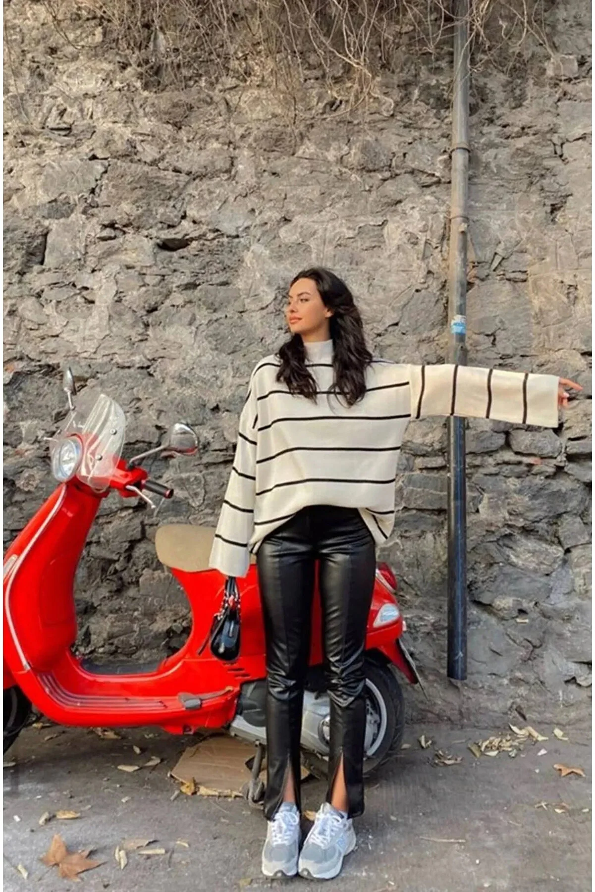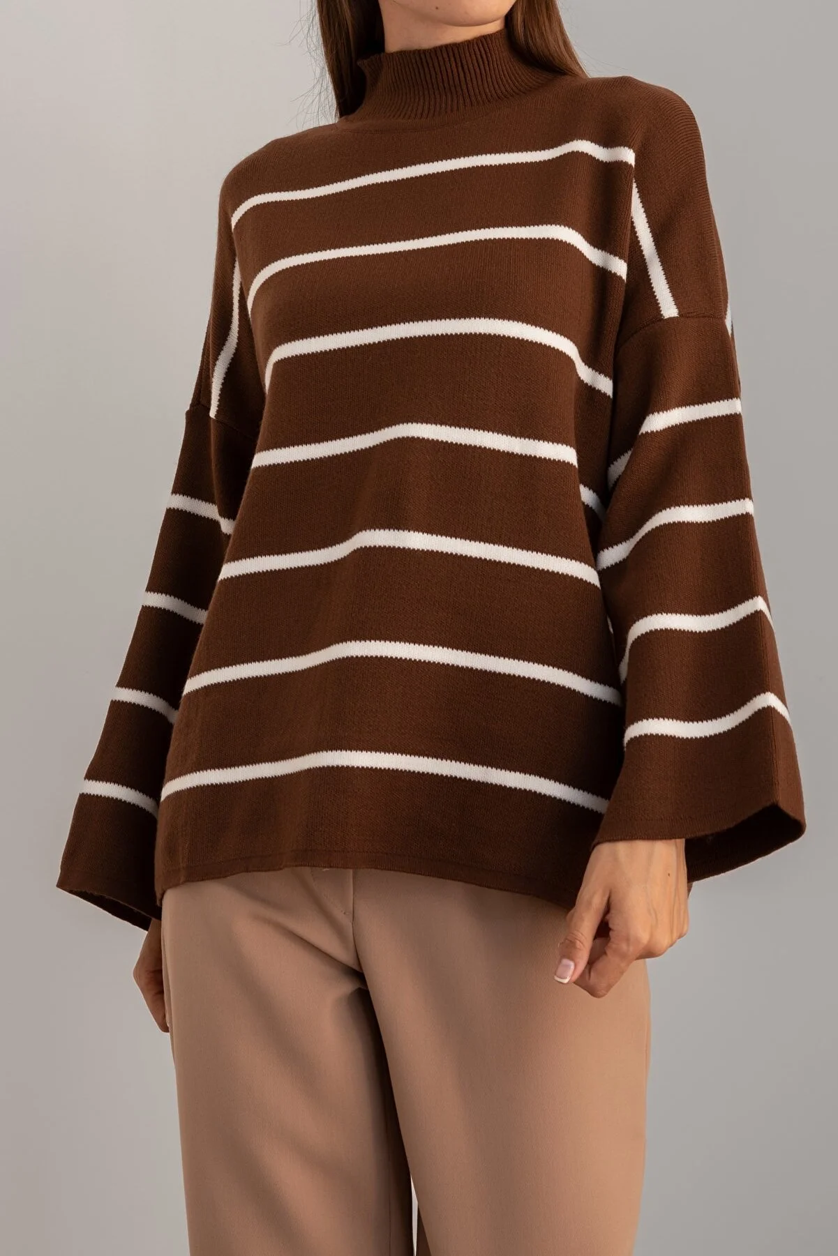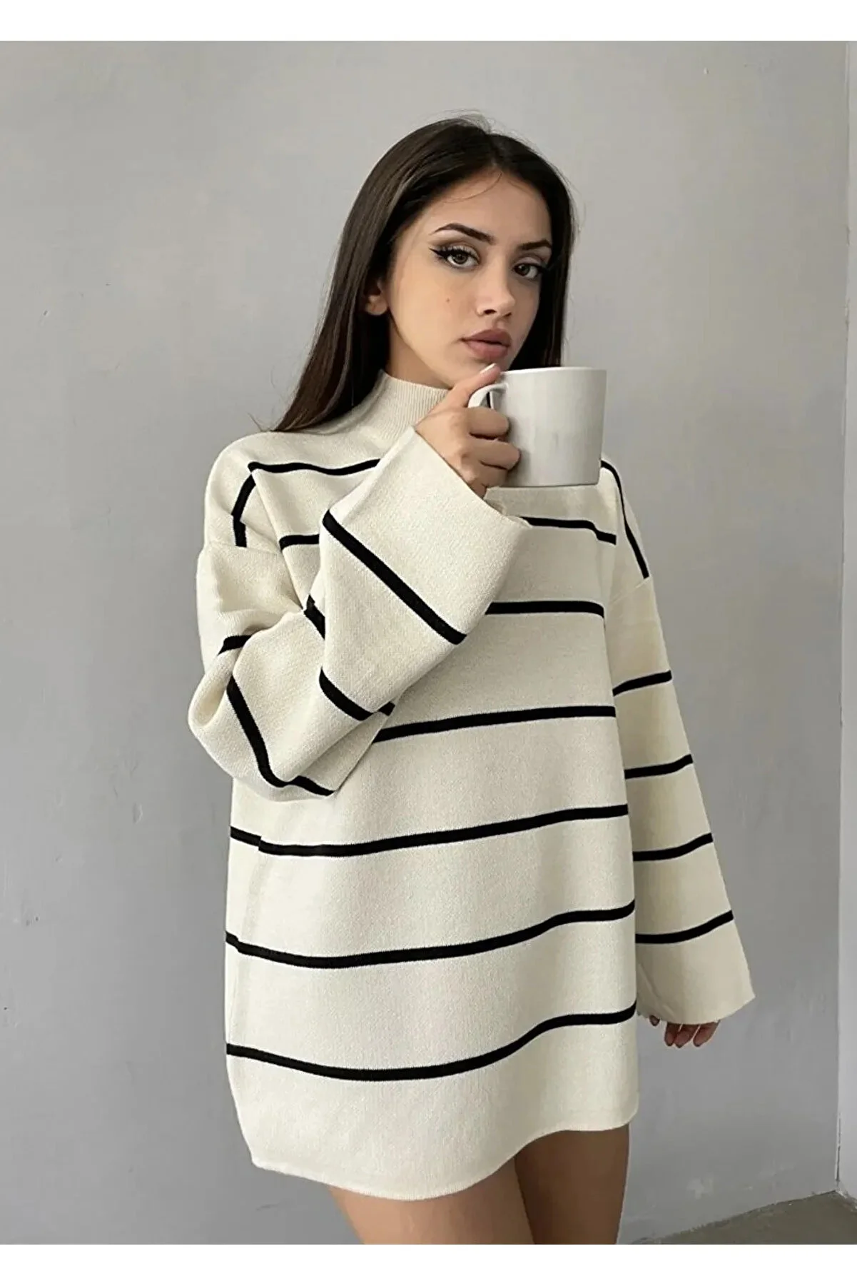 Elevate your style with this fantastic women's knit sweater from Nimas. Chic, comfortable, and versatile, this unique piece will make you feel special with its warmth and comfort. The half turtleneck design adds a touch of elegance, making it a staple in your wardrobe. The sweater features a trendy striped pattern, standard sleeves, and a medium thickness, suitable for casual or daily wear. Crafted from quality acrylic material, this sweater combines fashion and functionality seamlessly. The model, with measurements of 1.77m height, 86cm bust, 60cm waist, and 90cm hips, showcases the standard fit. Make a statement with this must-have addition to your collection