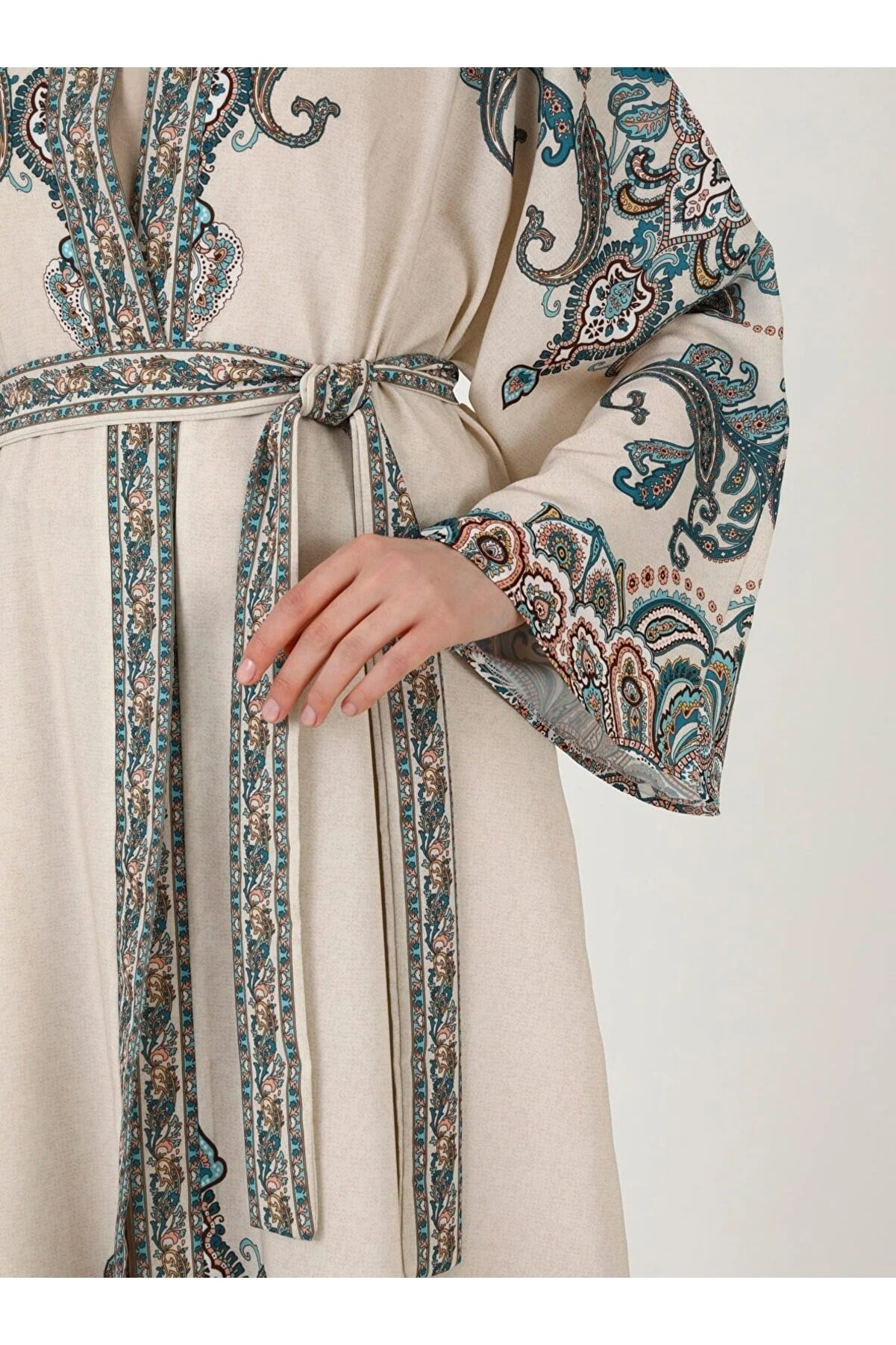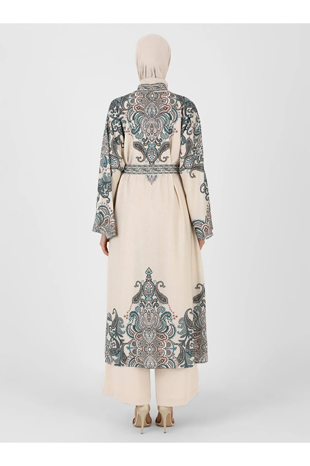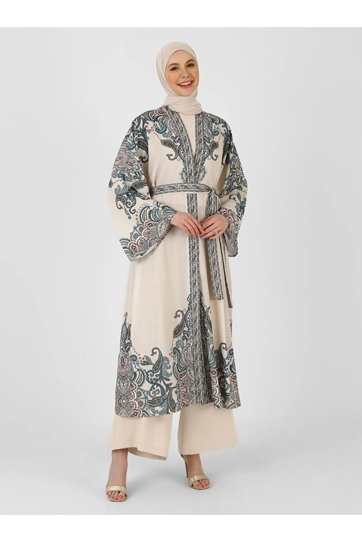 Indulge in the enchanting allure of the Refka Woman Floral Patterned Kimono. This exquisite piece in beige and green boasts a delightful floral pattern, adding a touch of nature's beauty to your wardrobe.