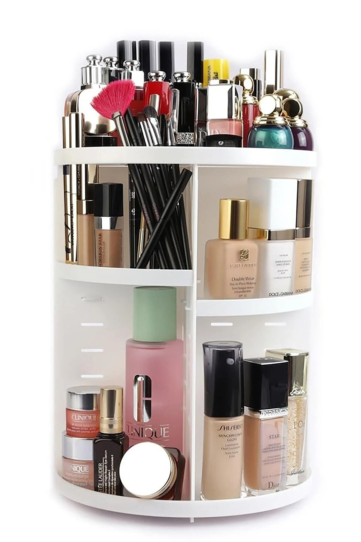 The 360-degree rotating makeup organizer is designed to help you organize your makeup products, skincare items, and personal belongings in a neat and efficient manner.