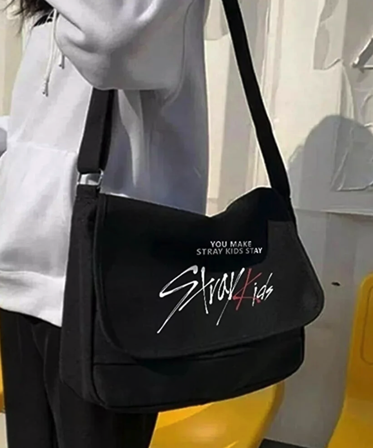 Kpop Series Stray Kids Printed Unisex Black Messenger Bag Printed Unisex Messenger Bag is a Two-Compartment Lined Product. The laptop fits easily and its interior volume is very wide. You can put as many notebooks as you want. It is a water-repellent fabric with a different design that you will love to use. It can be used both as a cross and a sleeve bag. The print does not fade. Width: 37 cm. Height: 25 cm