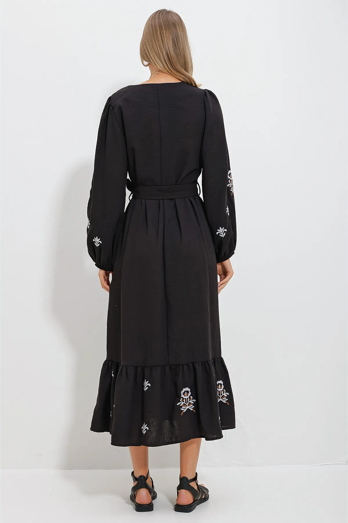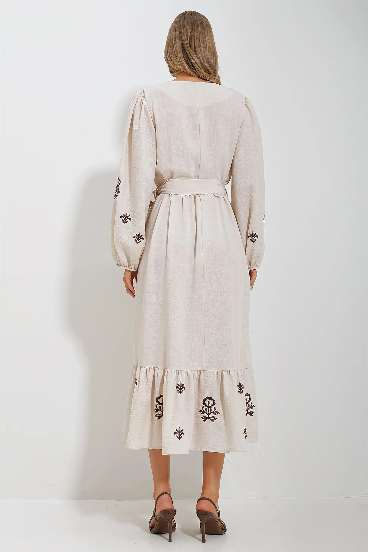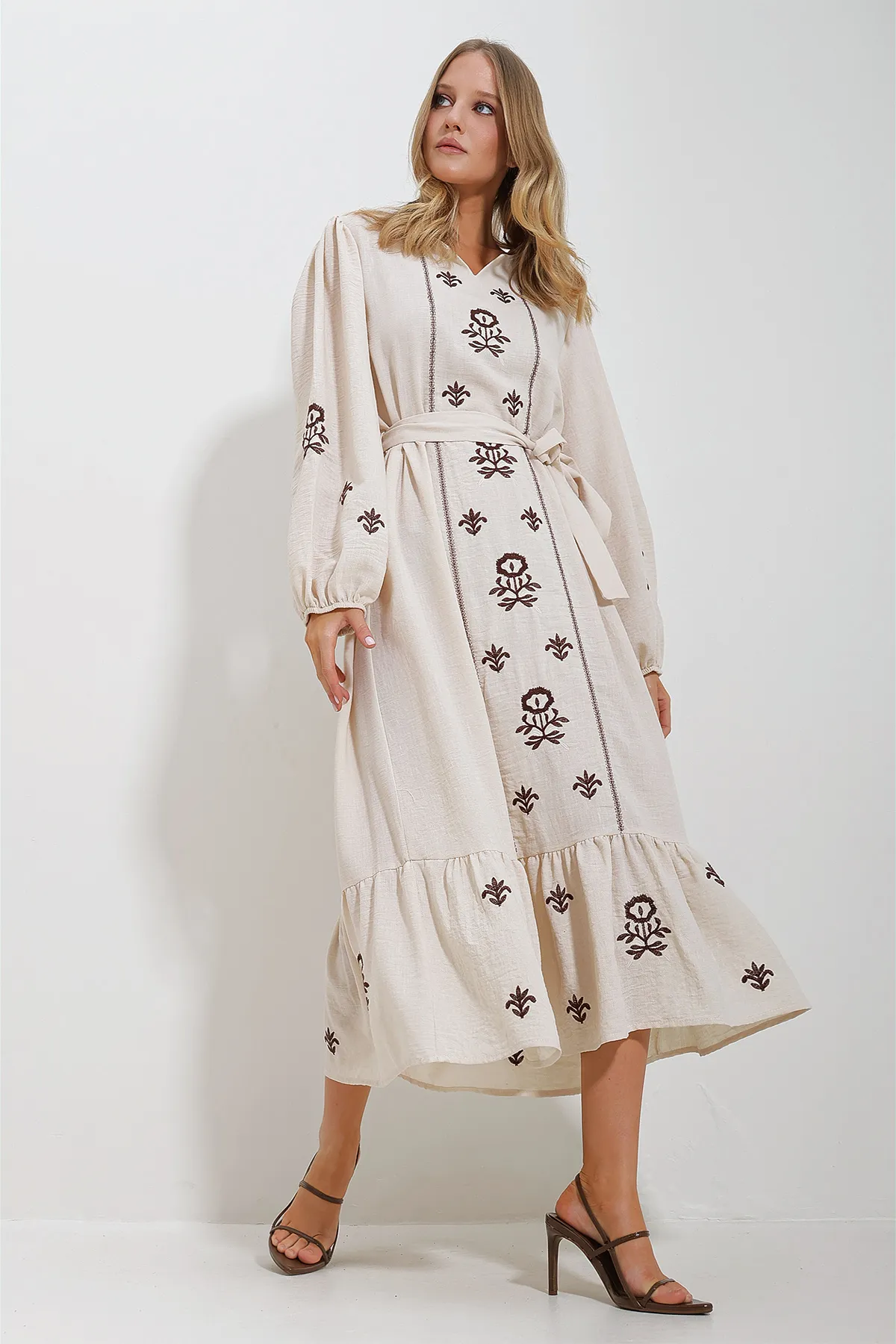 This beige maxi dress embodies the trendy Aegean style with its split neckline, belted waist, and delicate embroidery. Designed for women who appreciate chic and elegant attire, this dress features a relaxed fit that will be the essential fashion staple for spring and summer.